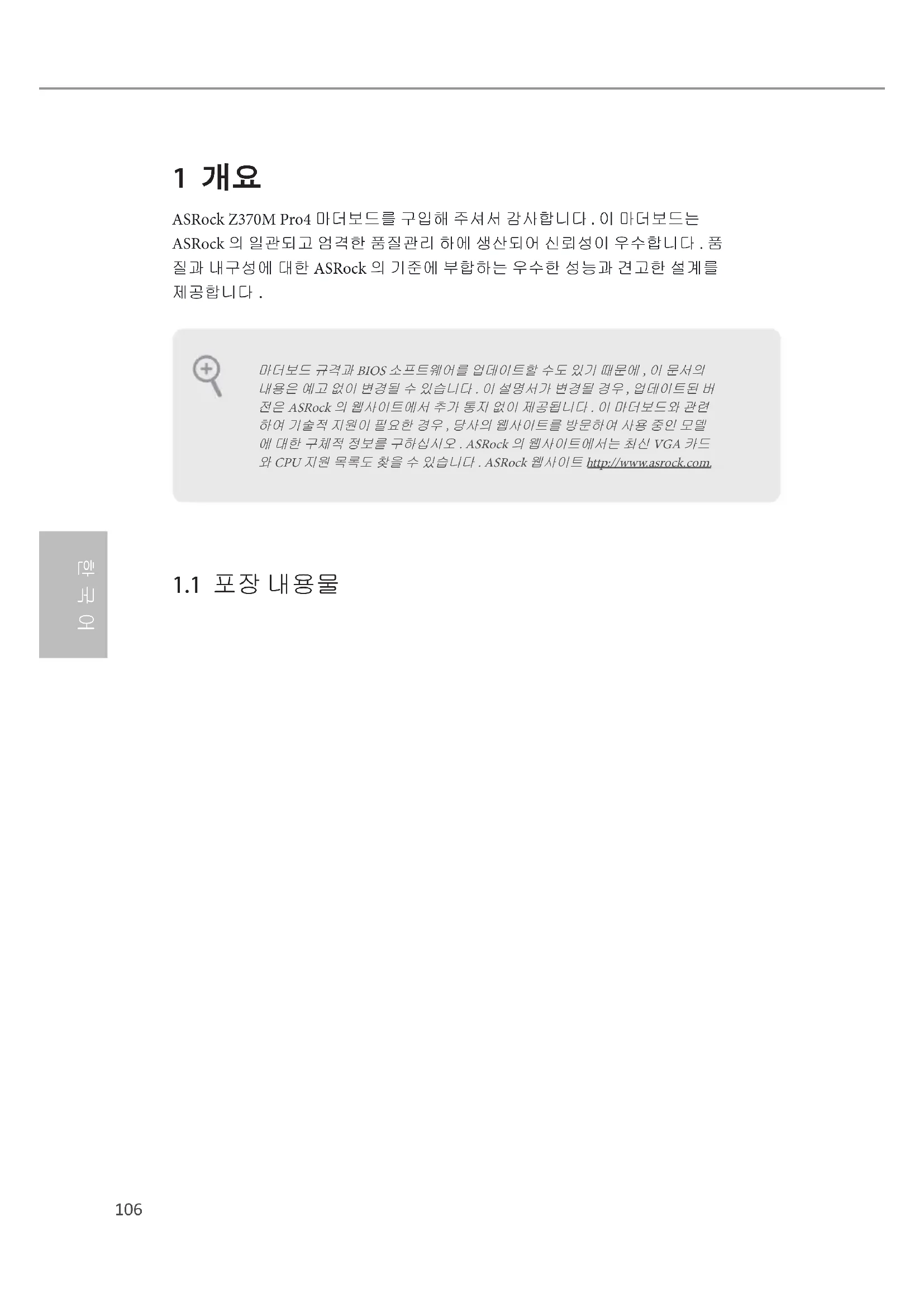 1 개요 ASRock Z370M Pro4 마더보드를 구입해 주셔서 감사합니다 . 이 마더보드는 ASRock 의 일관되고 엄격한 품질관리 하에 생산되어 신뢰성이 우수합니다 . 품 질과 내구성에 대한 ASRock 의 기준에 부합하는 우수한 성능과 견고한 설계를