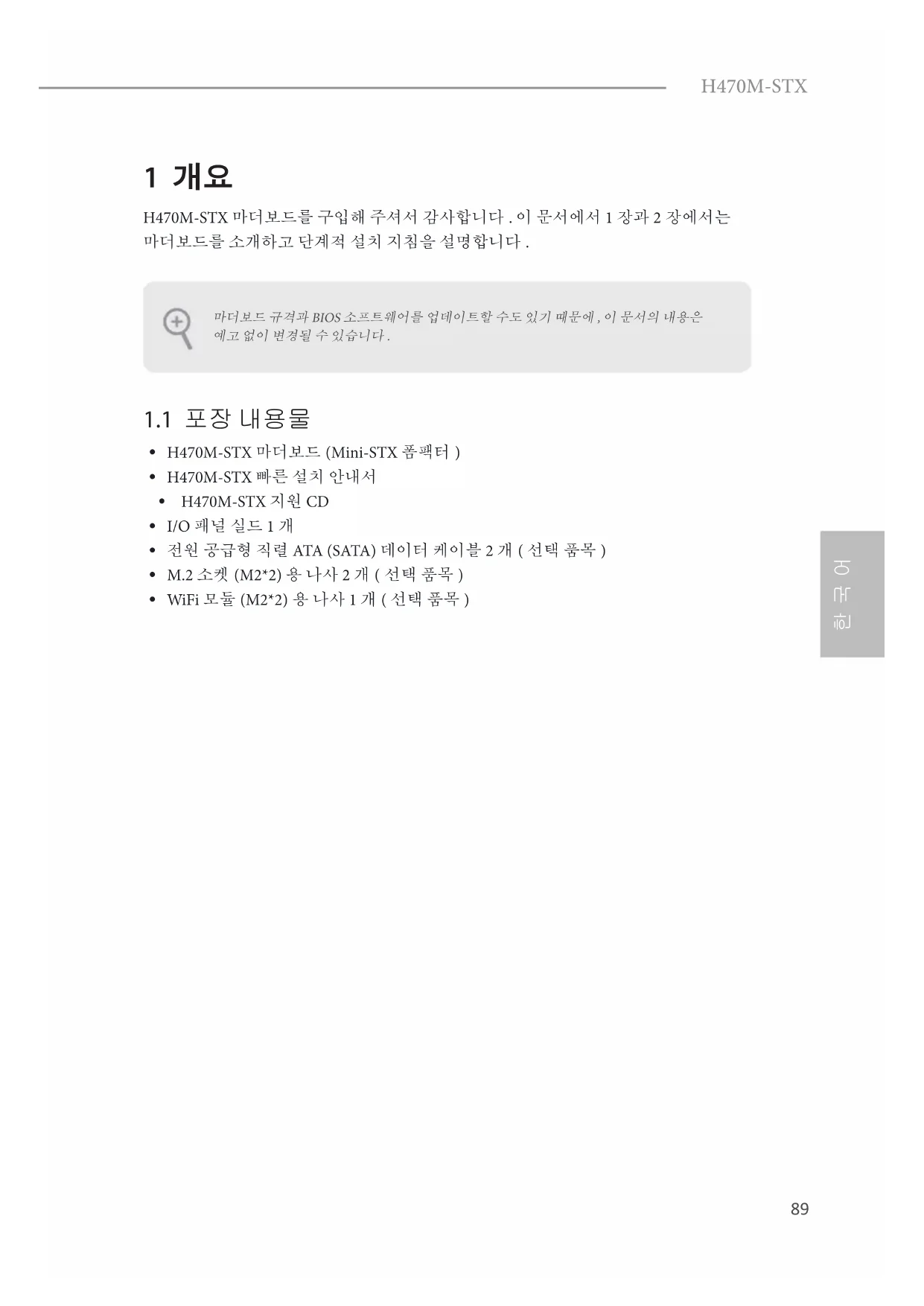 1 개요 H470M-STX 마더보드를 구입해 주셔서 감사합니다 . 이 문서에서 1 장과 2 장에서는 마더보드를 소개하고 단계적 설치 지침을 설명합니다 . 마더보드 규격과 BIOS 소프트웨어를 업데이트할 수도 있기 때문에 , 이 문서의 내용은 예고 없이 변경될 수 있습니다 .