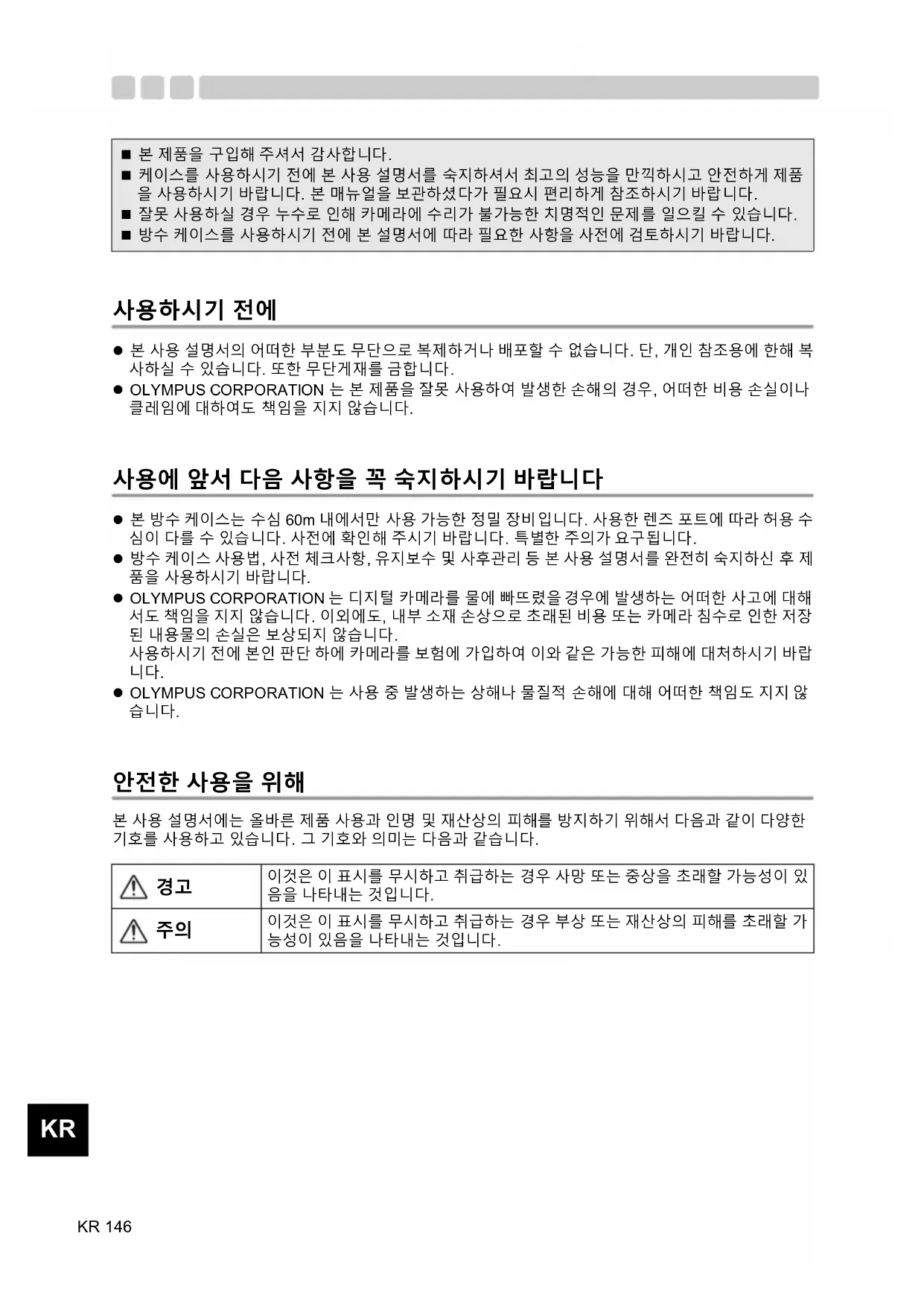 z 본 사용 설명서의 어떠한 부분도 무단으로 복제하거나 배포할 수 없습니다. 단, 개인 참조용에 한해 복 사하실 수 있습니다. 또한 무단게재를 금합니다. z OLYMPUS CORPORATION 는 본 제품을 잘못 사용하여 발생한 손해의 경우, 어떠한 비용 손실이나 클레임에 대하여도 책임을 지지 않습니다. 사용에 앞서 다음 사항을 꼭 숙지하시기 바랍니다 z 본 방수 케이스는 수심 60m 내에서만 사용 가능한 정밀 장비입니다. 사용한 렌즈 포트에 따라 허용 수 심이 다를 수 있습니다. 사전에 확인해 주시기 바랍니다. 특별한 주의가 요구됩니다. z 방수 케이스 사용법, 사전 체크사항, 유지보수 및 사후관리 등 본 사용 설명서를 완전히 숙지하신 후 제 품을 사용하시기 바랍니다. z OLYMPUS CORPORATION 는 디지털 카메라를 물에 빠뜨렸을 경우에 발생하는 어떠한 사고에 대해 서도 책임을 지지 않습니다. 이외에도, 내부 소재 손상으로 초래된 비용 또는 카메라 침수로 인한 저장 된 내용물의 손실은 보상되지 않습니다. 사용하시기 전에 본인 판단 하에 카메라를 보험에 가입하여 이와 같은 가능한 피해에 대처하시기 바랍