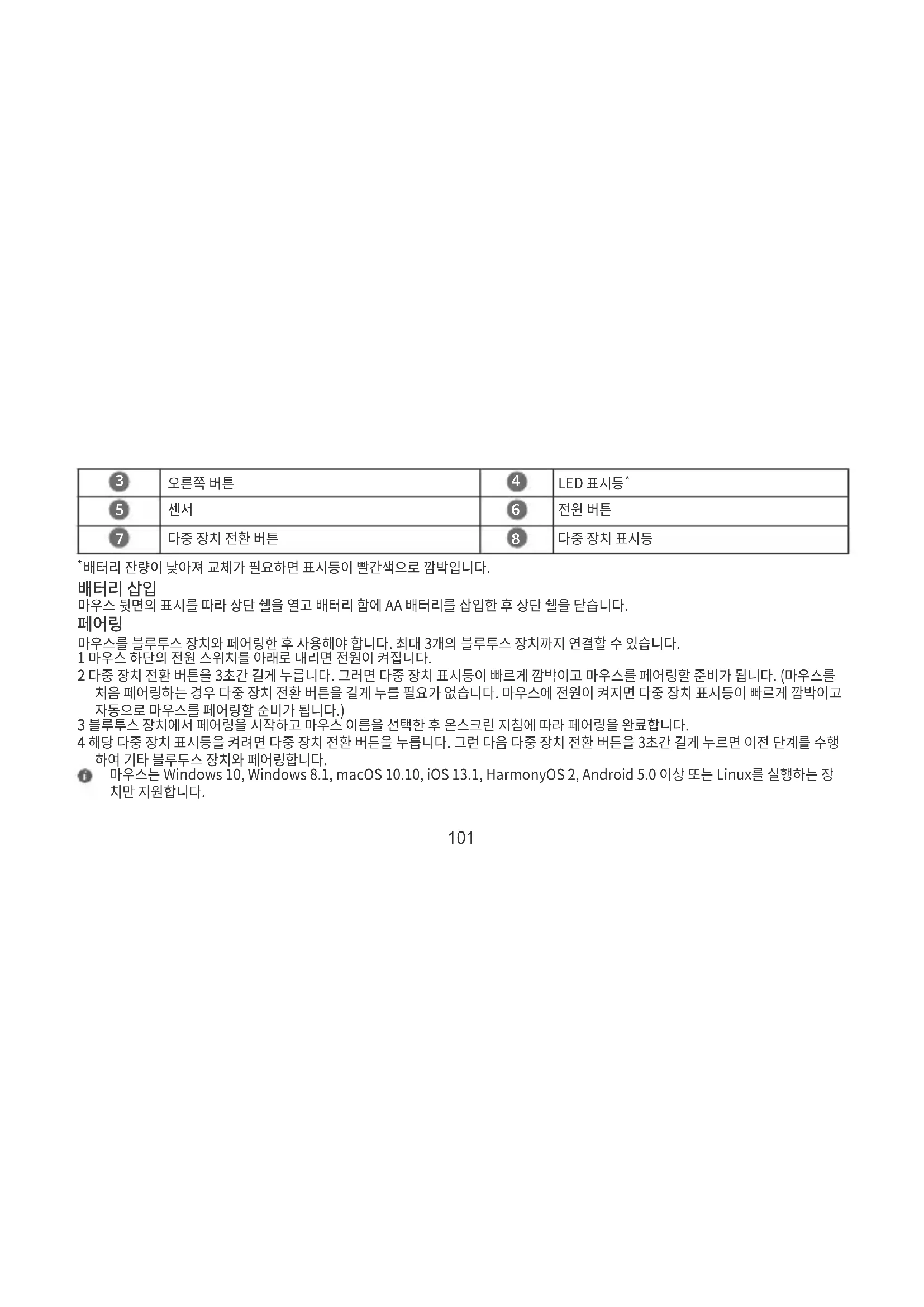 마우스를 블루투스 장치와 페어링한 후 사용해야 합니다. 최대 3개의 블루투스 장치까지 연결할 수 있습니다. 1 마우스 하단의 전원 스위치를 아래로 내리면 전원이 켜집니다. 2 다중 장치 전환 버튼을 3초간 길게 누릅니다. 그러면 다중 장치 표시등이 빠르게 깜박이고 마우스를 페어링할 준비가 됩니다. (마우스를 처음 페어링하는 경우 다중 장치 전환 버튼을 길게 누를 필요가 없습니다. 마우스에 전원이 켜지면 다중 장치 표시등이 빠르게 깜박이고 자동으로 마우스를 페어링할 준비가 됩니다.) 3 블루투스 장치에서 페어링을 시작하고 마우스 이름을 선택한 후 온스크린 지침에 따라 페어링을 완료합니다. 4 해당 다중 장치 표시등을 켜려면 다중 장치 전환 버튼을 누릅니다. 그런 다음 다중 장치 전환 버튼을 3초간 길게 누르면 이전 단계를 수행 하여 기타 블루투스 장치와 페어링합니다. 마우스는 Windows 10, Windows 8.1, macOS 10.10, iOS 13.1, HarmonyOS 2, Android 5.0 이상 또는 Linux를 실행하는 장