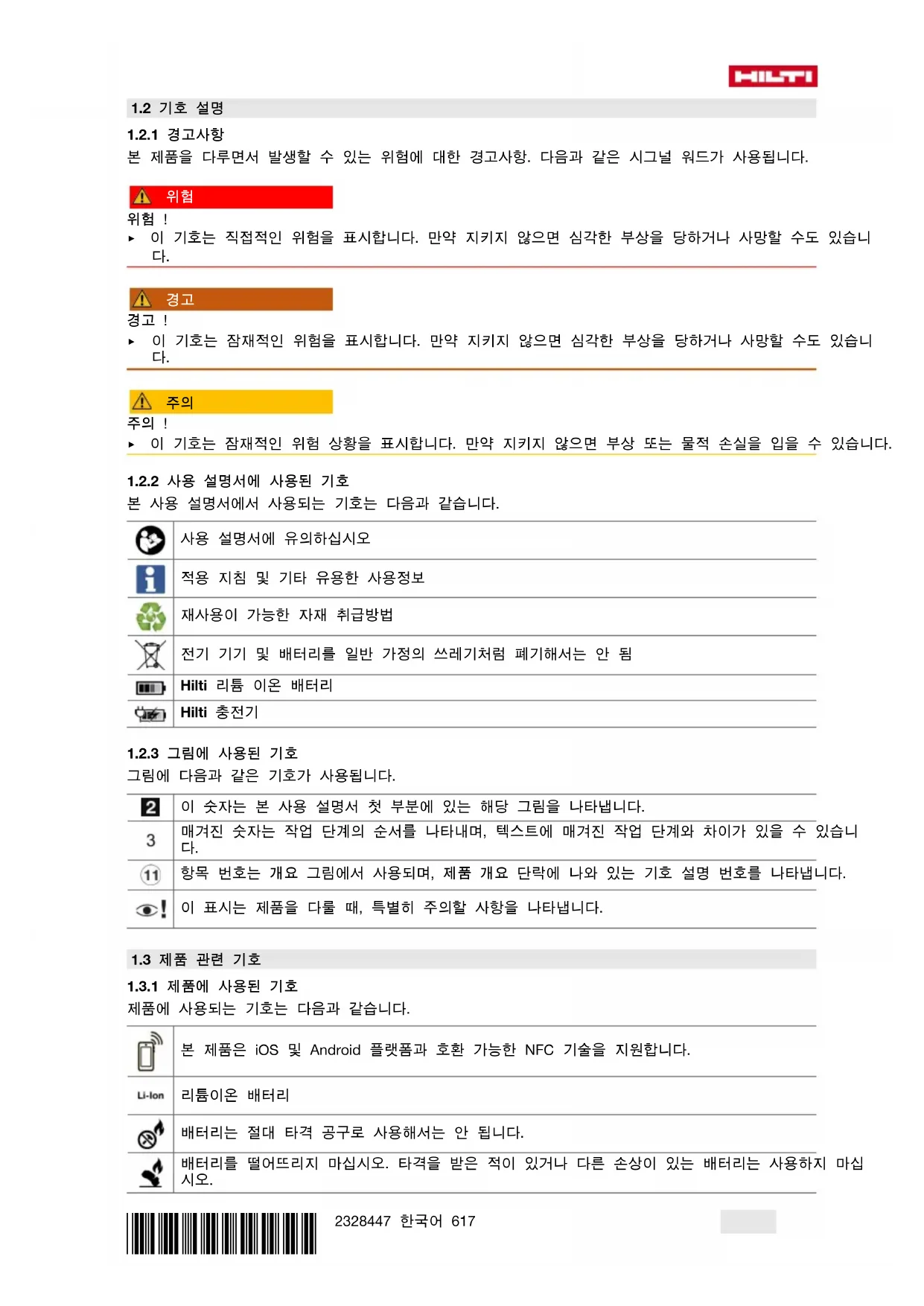 본 사용 설명서에서 사용되는 기호는 다음과 같습니다. 사용 설명서에 유의하십시오 적용 지침 및 기타 유용한 사용정보 재사용이 가능한 자재 취급방법 전기 기기 및 배터리를 일반 가정의 쓰레기처럼 폐기해서는 안 됨 Hilti 리튬 이온 배터리 Hilti 충전기