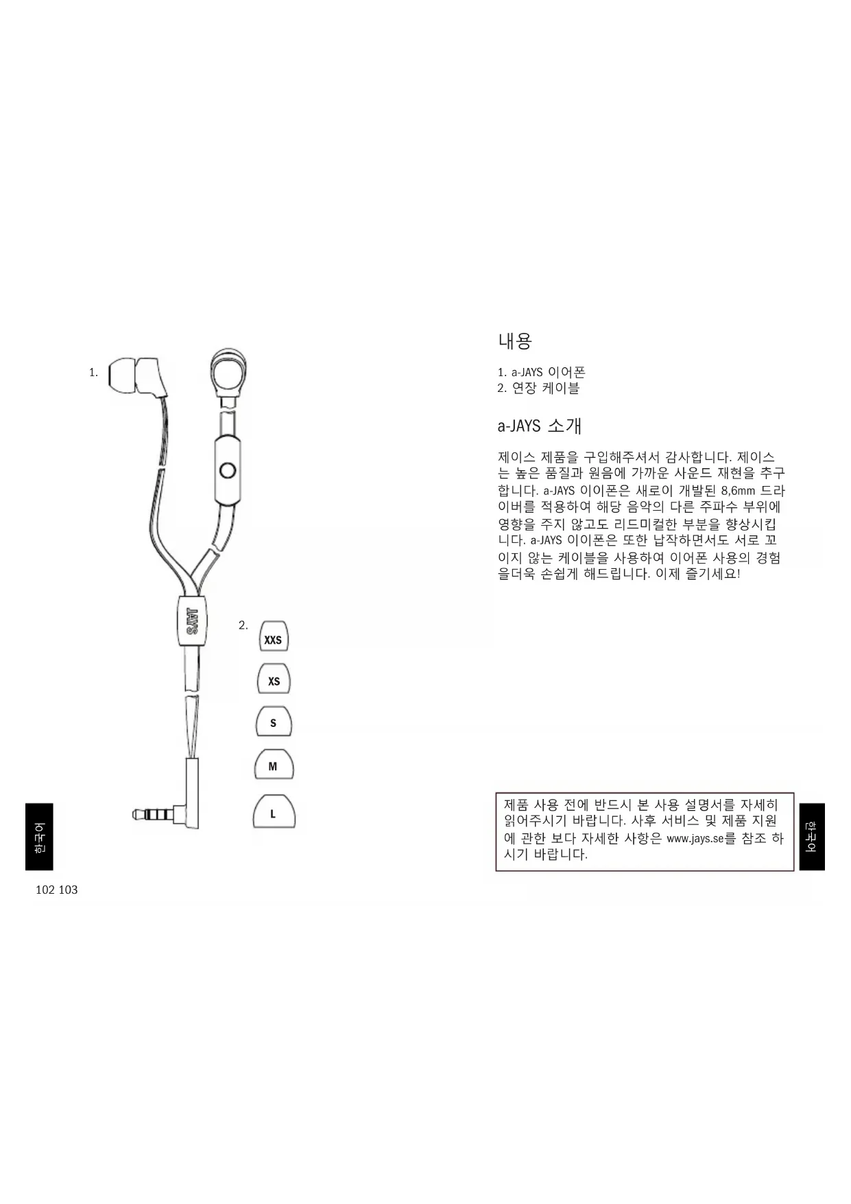 a-JAYS 소개 제이스 제품을 구입해주셔서 감사합니다. 제이스 는 높은 품질과 원음에 가까운 사운드 재현을 추구 합니다. a-JAYS 이이폰은 새로이 개발된 8,6mm 드라 이버를 적용하여 해당 음악의 다른 주파수 부위에 영향을 주지 않고도 리드미컬한 부분을 향상시킵 니다. a-JAYS 이이폰은 또한 납작하면서도 서로 꼬 이지 않는 케이블을 사용하여 이어폰 사용의 경험 을더욱 손쉽게 해드립니다. 이제 즐기세요! 제품 사용 전에 반드시 본 사용 설명서를 자세히 읽어주시기 바랍니다. 사후 서비스 및 제품 지원 에 관한 보다 자세한 사항은 www.jays.se를 참조 하