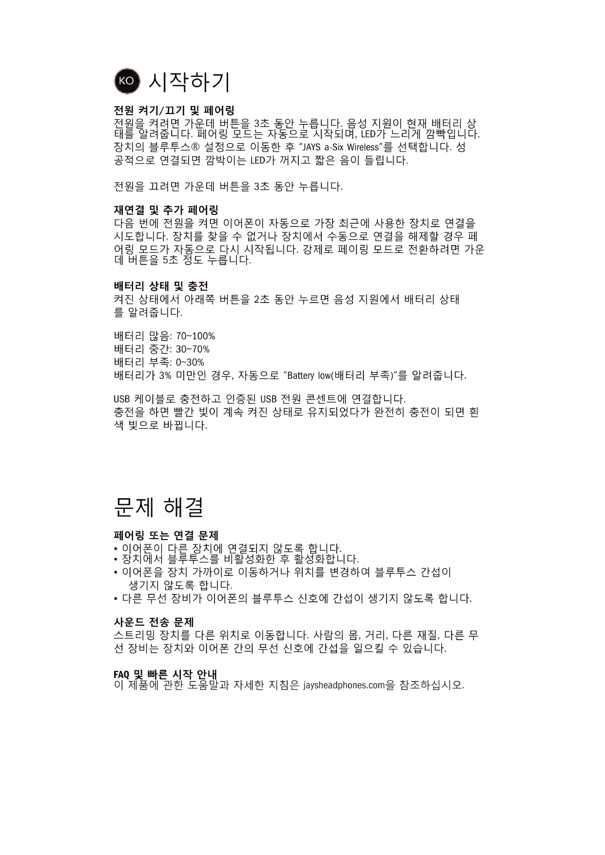 如欲在有限保養期內申請保養服務,請聯絡產品轉銷商以尋求進一步協助。您將要 提供購買證明及問題零件。有限保養範圍內的任何缺陷零件將得到免費維修或替換。 保養期內提供的替換或維修零件,將在原始保養期的餘下期限或維修或替換日期 起計六十 (60) 天內(以較長者為準)得到保養。常見問題載於 www.jaysheadphones.com。시작하기 전원 켜기/끄기 및 페어링 전원을 켜려면 가운데 버튼을 3초 동안 누릅니다. 음성 지원이 현재 배터리 상 태를 알려줍니다. 페어링 모드는 자동으로 시작되며, LED가 느리게 깜빡입니다. 장치의 블루투스® 설정으로 이동한 후 “JAYS a-Six Wireless”를 선택합니다. 성 공적으로 연결되면 깜박이는 LED가 꺼지고 짧은 음이 들립니다. 전원을 끄려면 가운데 버튼을 3초 동안 누릅니다. 재연결 및 추가 페어링 다음 번에 전원을 켜면 이어폰이 자동으로 가장 최근에 사용한 장치로 연결을 시도합니다. 장치를 찾을 수 없거나 장치에서 수동으로 연결을 해제할 경우 페 어링 모드가 자동으로 다시 시작됩니다. 강제로 페이링 모드로 전환하려면 가운 데 버튼을 5초 정도 누릅니다. 배터리 상태 및 충전 켜진 상태에서 아래쪽 버튼을 2초 동안 누르면 음성 지원에서 배터리 상태