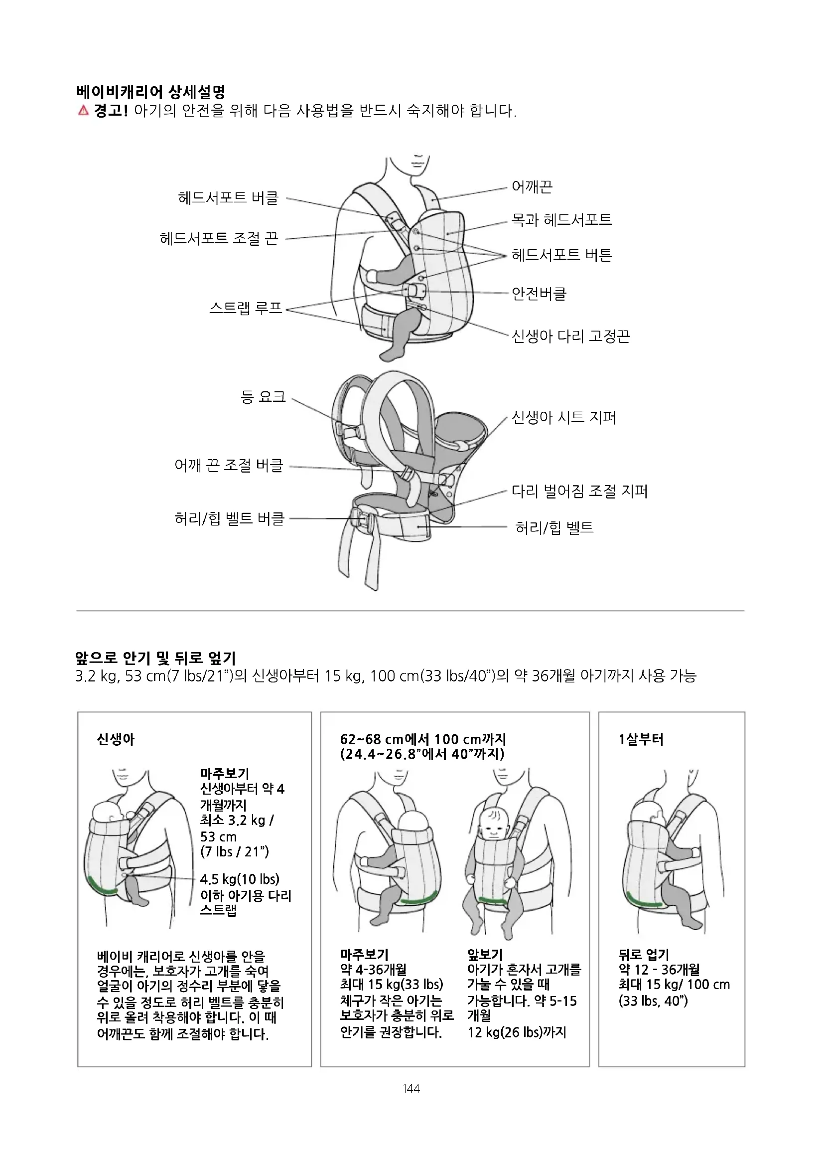 베이비캐리어 상세설명 경고! 아기의 안전을 위해 다음 사용법을 반드시 숙지해야 합니다.144 145