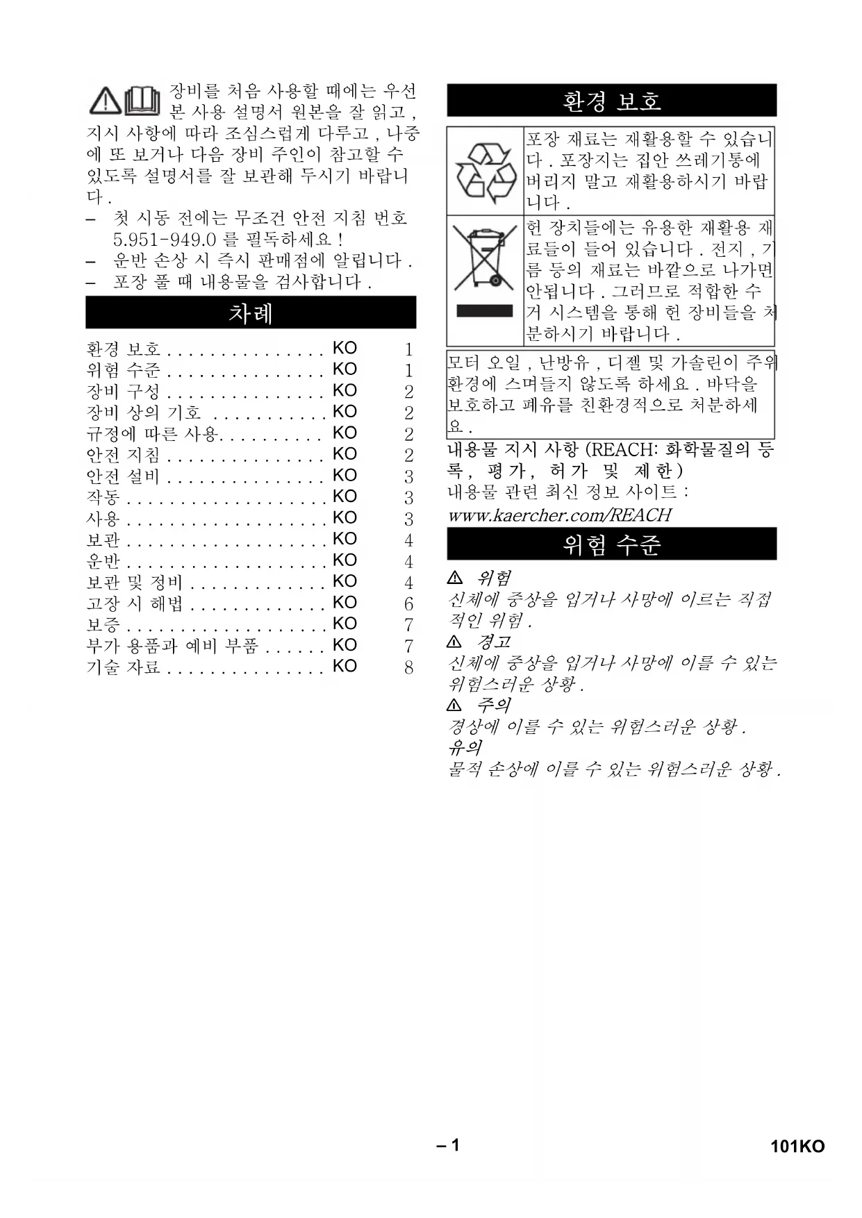 – 첫 시동 전에는 무조건 안전 지침 번호 5.951-949.0 를 필독하세요 ! – 운반 손상 시 즉시 판매점에 알립니다 . – 포장 풀 때 내용물을 검사합니다 . 내용물 지시 사항 (REACH: 화학물질의 등 록, 평가, 허가 및 제한) 내용물 관련 최신 정보 사이트 : www.kaercher.com/REACH