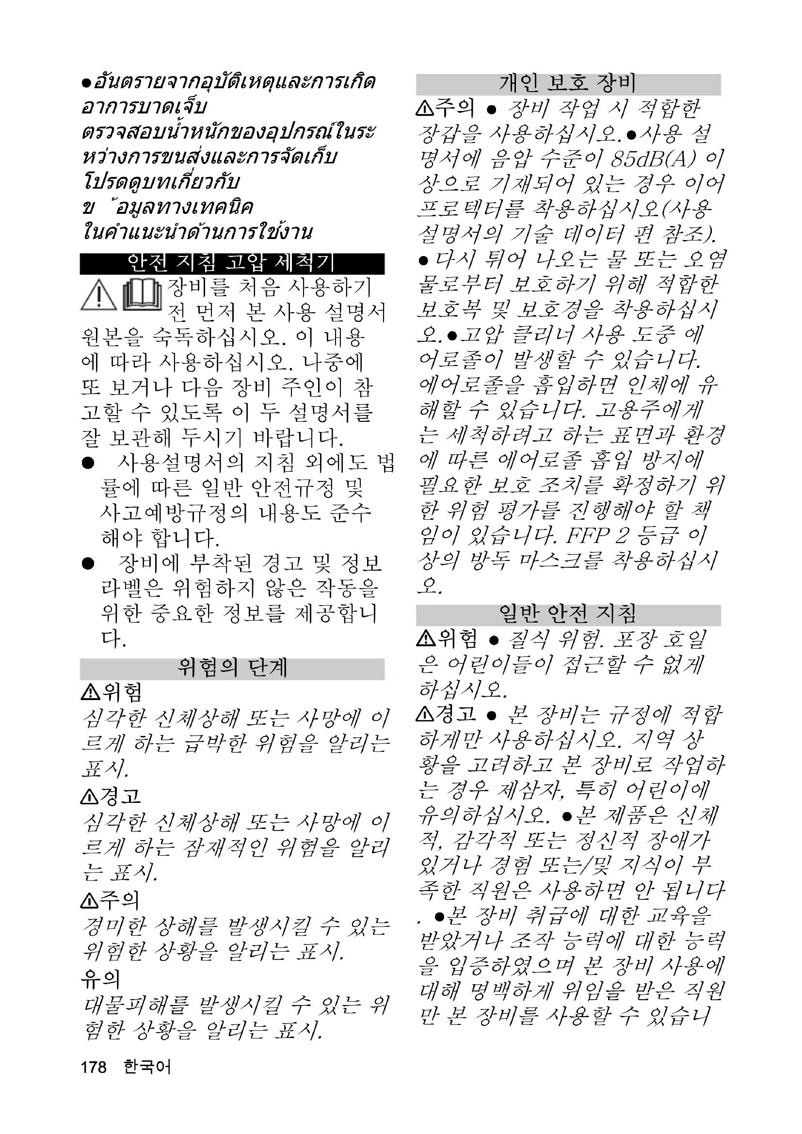 안전 지침 고압 세척기 장비를 처음 사용하기 전 먼저 본 사용 설명서 원본을 숙독하십시오. 이 내용 에 따라 사용하십시오. 나중에 또 보거나 다음 장비 주인이 참 고할 수 있도록 이 두 설명서를 잘 보관해 두시기 바랍니다. 사용설명서의 지침 외에도 법 률에 따른 일반 안전규정 및 사고예방규정의 내용도 준수