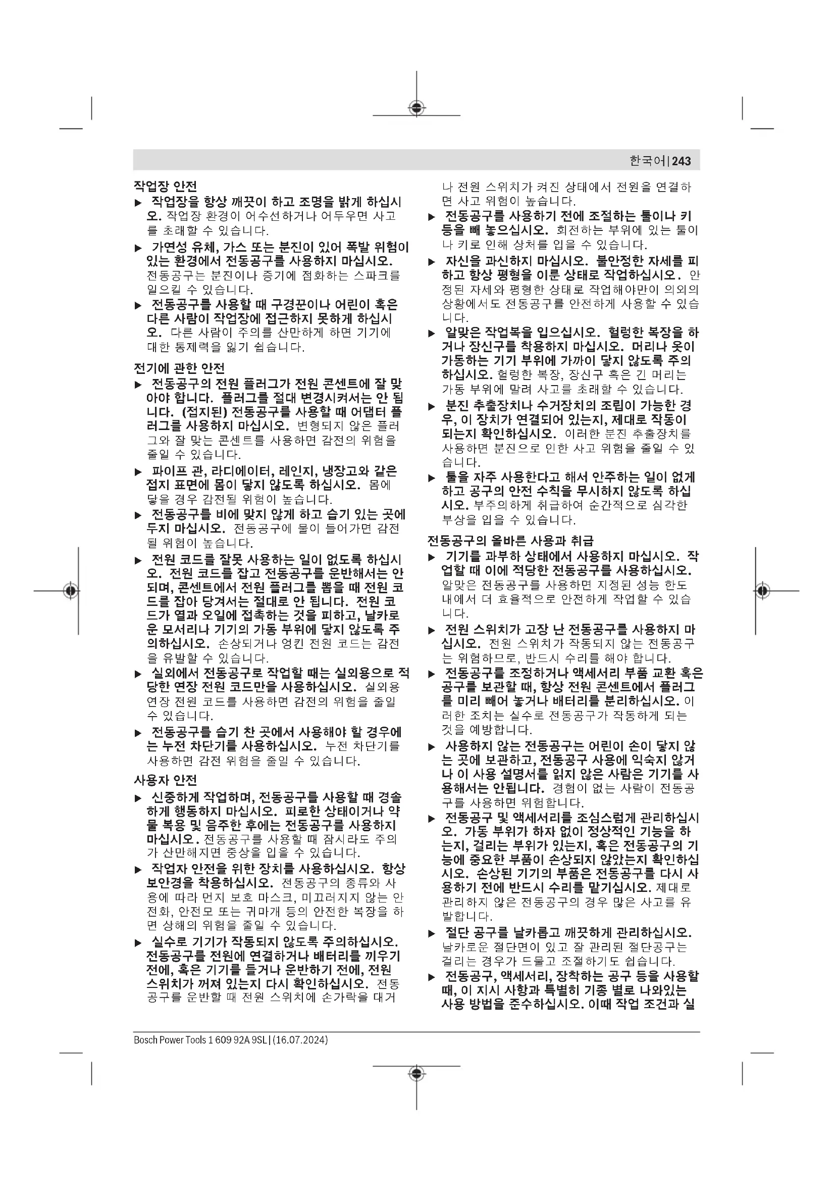 u 절단 공구를 날카롭고 깨끗하게 관리하십시오. 날카로운 절단면이 있고 잘 관리된 절단공구는 걸리는 경우가 드물고 조절하기도 쉽습니다. u 전동공구, 액세서리, 장착하는 공구 등을 사용할 때, 이 지시 사항과 특별히 기종 별로 나와있는 사용 방법을 준수하십시오. 이때 작업 조건과 실 Bosch Power Tools 1 609 92A 9SL | (16.07.2024)244 | 한국어 시하려는 작업 내용을 고려하십시오. 원래 사용 분야가 아닌 다른 작업에 전동공구를 사용할 경 우 위험한 상황을 초래할 수 있습니다. u 손잡이 및 잡는 면을 건조하게 유지하고, 오일 및 그리스가 묻어 있지 않도록 깨끗하게 하십시오. 손잡이 또는 잡는 면이 미끄러우면 예상치 못한 상황에서 안전한 취급 및 제어가 어려워집니다. 충전 전동공구의 올바른 사용과 취급 u 배터리를 충전할 때 제조 회사가 추천하는 충전 기만을 사용하여 재충전해야 합니다. 특정 제품 의 배터리를 위하여 제조된 충전기에 적합하지 않은 다른 배터리를 충전할 경우 화재 위험이 있