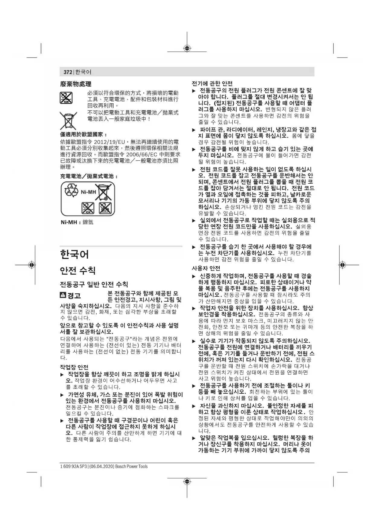 전동공구와 충전용 배터리/배터리를 가 정용 쓰레기로 처리하지 마십시오! 오직 EU 국가에만 해당: 더이상 사용할 수 없는 전동공구 및 사용한 충전용 배터리/배터리는 유럽 가이드라인 2012/19/EU 및 유럽 가이드라인 2006/66/EC에 따라 분리 수거하 여 환경 규정에 맞춰 재활용해야 합니다. 충전용 배터리/배터리: Ni-MH: 니켈-메탈하이브리드