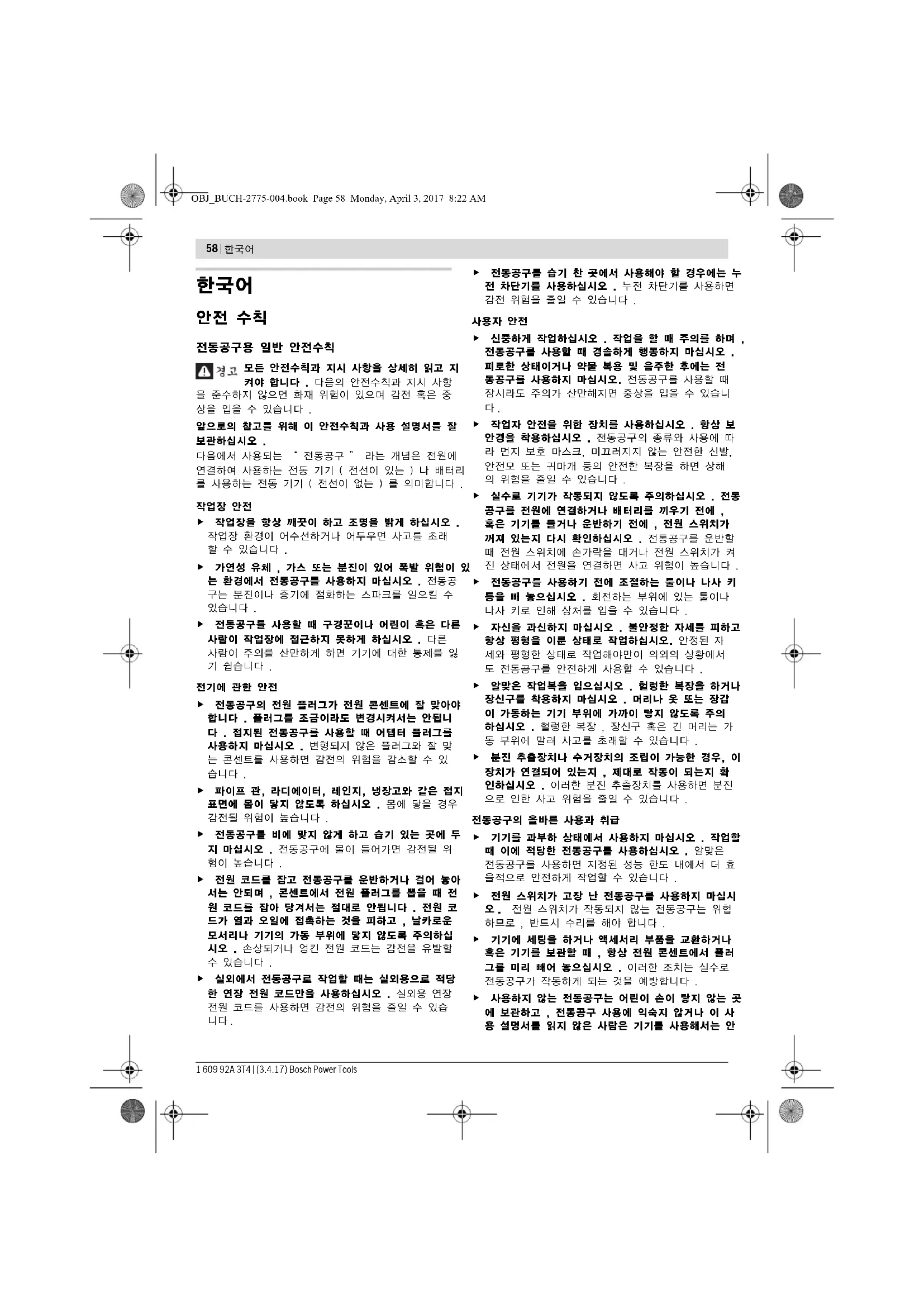 작업자 안전을 위한 장치를 사용하십시오 . 항상 보 안경을 착용하십시오 . 전동공구의 종류와 사용에 따 라 먼지 보호 마스크, 미끄러지지 않는 안전한 신발, 안전모 또는 귀마개 등의 안전한 복장을 하면 상해 의 위험을 줄일 수 있습니다 . 실수로 기기가 작동되지 않도록 주의하십시오 . 전동 공구를 전원에 연결하거나 배터리를 끼우기 전에 , 혹은 기기를 들거나 운반하기 전에 , 전원 스위치가 꺼져 있는지 다시 확인하십시오 . 전동공구를 운반할 때 전원 스위치에 손가락을 대거나 전원 스위치가 켜 진 상태에서 전원을 연결하면 사고 위험이 높습니다 . 전동공구를 사용하기 전에 조절하는 툴이나 나사 키 등을 빼 놓으십시오 . 회전하는 부위에 있는 툴이나 나사 키로 인해 상처를 입을 수 있습니다 . 자신을 과신하지 마십시오 . 불안정한 자세를 피하고 항상 평형을 이룬 상태로 작업하십시오. 안정된 자 세와 평형한 상태로 작업해야만이 의외의 상황에서 도 전동공구를 안전하게 사용할 수 있습니다 . 알맞은 작업복을 입으십시오 . 헐렁한 복장을 하거나 장신구를 착용하지 마십시오 . 머리나 옷 또는 장갑 이 가동하는 기기 부위에 가까이 닿지 않도록 주의 하십시오 . 헐렁한 복장 , 장신구 혹은 긴 머리는 가 동 부위에 말려 사고를 초래할 수 있습니다 . 분진 추출장치나 수거장치의 조립이 가능한 경우, 이 장치가 연결되어 있는지 , 제대로 작동이 되는지 확 인하십시오 . 이러한 분진 추출장치를 사용하면 분진 으로 인한 사고 위험을 줄일 수 있습니다 . 전동공구의 올바른 사용과 취급 기기를 과부하 상태에서 사용하지 마십시오 . 작업할 때 이에 적당한 전동공구를 사용하십시오 . 알맞은 전동공구를 사용하면 지정된 성능 한도 내에서 더 효 율적으로 안전하게 작업할 수 있습니다 . 전원 스위치가 고장 난 전동공구를 사용하지 마십시 오. 전원 스위치가 작동되지 않는 전동공구는 위험 하므로 , 반드시 수리를 해야 합니다 . 기기에 세팅을 하거나 액세서리 부품을 교환하거나 혹은 기기를 보관할 때 , 항상 전원 콘센트에서 플러 그를 미리 빼어 놓으십시오 . 이러한 조치는 실수로 전동공구가 작동하게 되는 것을 예방합니다 . 사용하지 않는 전동공구는 어린이 손이 닿지 않는 곳 에 보관하고 , 전동공구 사용에 익숙지 않거나 이 사 용 설명서를 읽지 않은 사람은 기기를 사용해서는 안 OBJ_BUCH-2775-004.book Page 58 Monday, April 3, 2017 8:22 AM한국어 | 59 Bosch Power Tools 1 609 92A 3T4 | (3.4.17) 됩니다 . 경험이 없는 사람이 전동공구를 사용하면