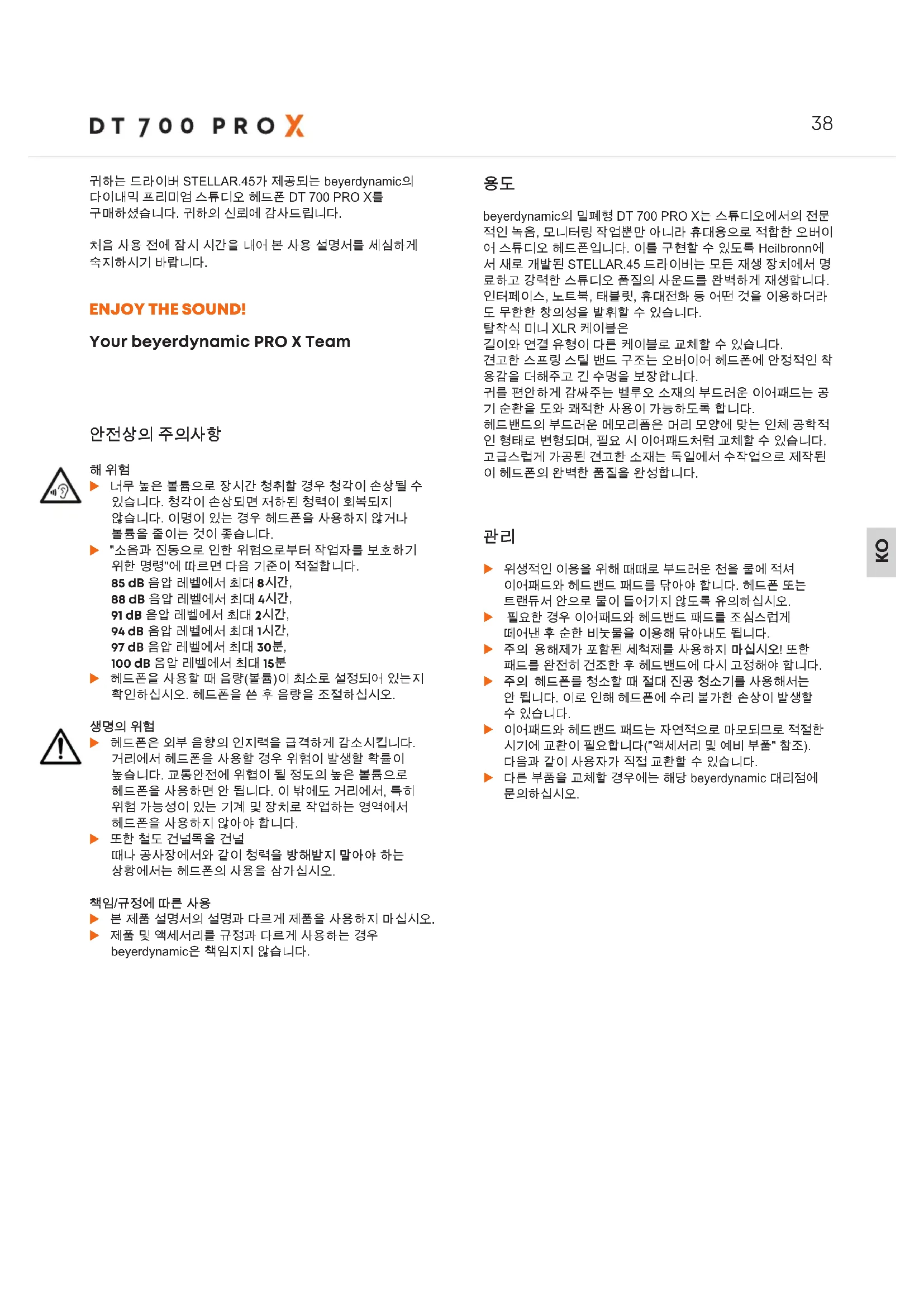u 헤드폰은 외부 음향의 인지력을 급격하게 감소시킵니다. 거리에서 헤드폰을 사용할 경우 위험이 발생할 확률이 높습니다. 교통안전에 위협이 될 정도의 높은 볼륨으로 헤드폰을 사용하면 안 됩니다. 이 밖에도 거리에서, 특히 위험 가능성이 있는 기계 및 장치로 작업하는 영역에서 헤드폰을 사용하지 않아야 합니다. u 또한 철도 건널목을 건널 때나 공사장에서와 같이 청력을 방해받지 말아야 하는 상황에서는 헤드폰의 사용을 삼가십시오. 책임/규정에 따른 사용 u 본 제품 설명서의 설명과 다르게 제품을 사용하지 마십시오. u 제품 및 액세서리를 규정과 다르게 사용하는 경우 beyerdynamic은 책임지지 않습니다.