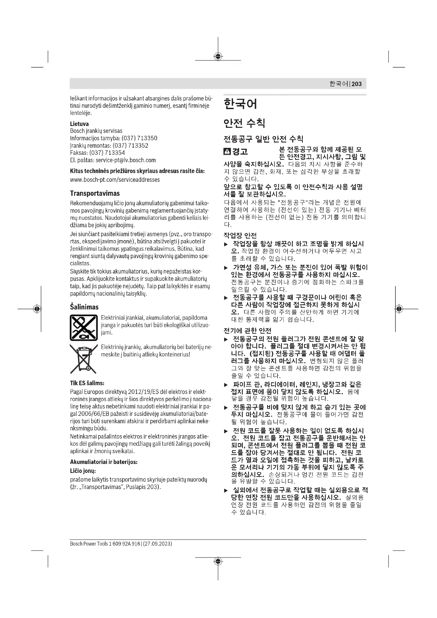Bosch Power Tools 1 609 92A 916 | (27.09.2023)204 | 한국어 u 전동공구를 습기 찬 곳에서 사용해야 할 경우에 는 누전 차단기를 사용하십시오. 누전 차단기를 사용하면 감전 위험을 줄일 수 있습니다.