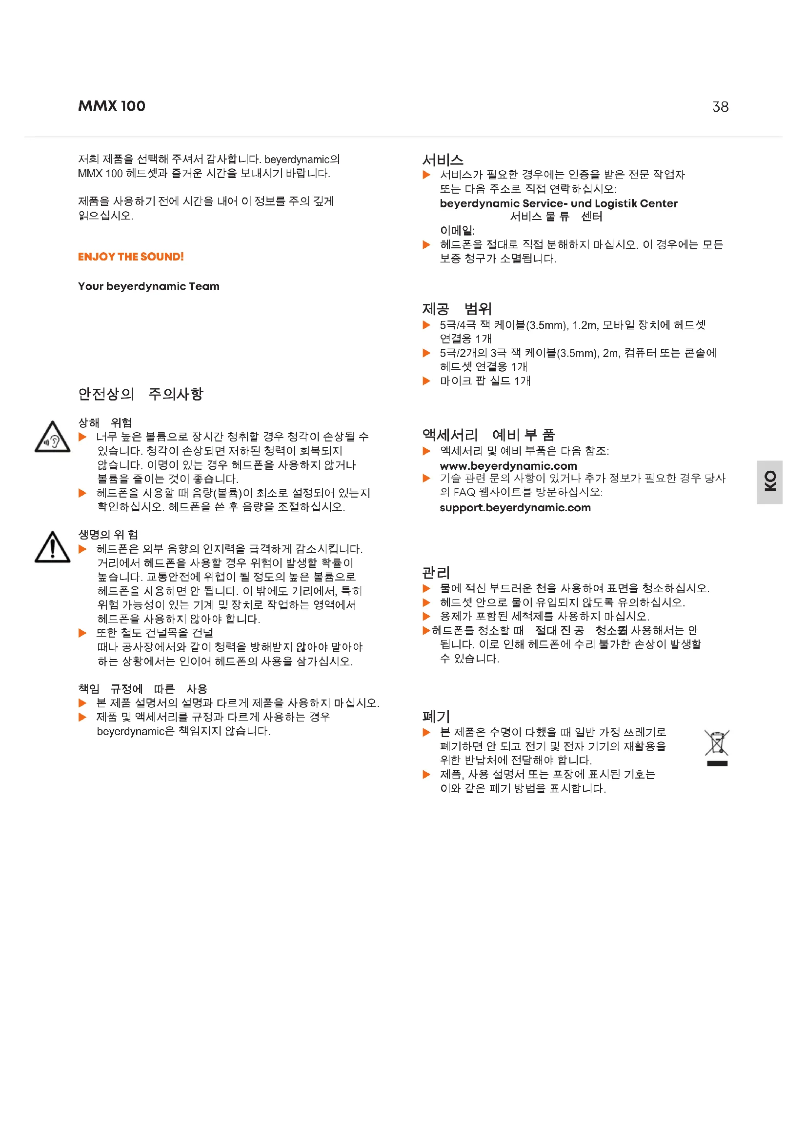 저희 제품을 선택해 주셔서 감사합니다. beyerdynamic의 MMX 100 헤드셋과 즐거운 시간을 보내시기 바랍니다. 제품을 사용하기 전에 시간을 내어 이 정보를 주의 깊게