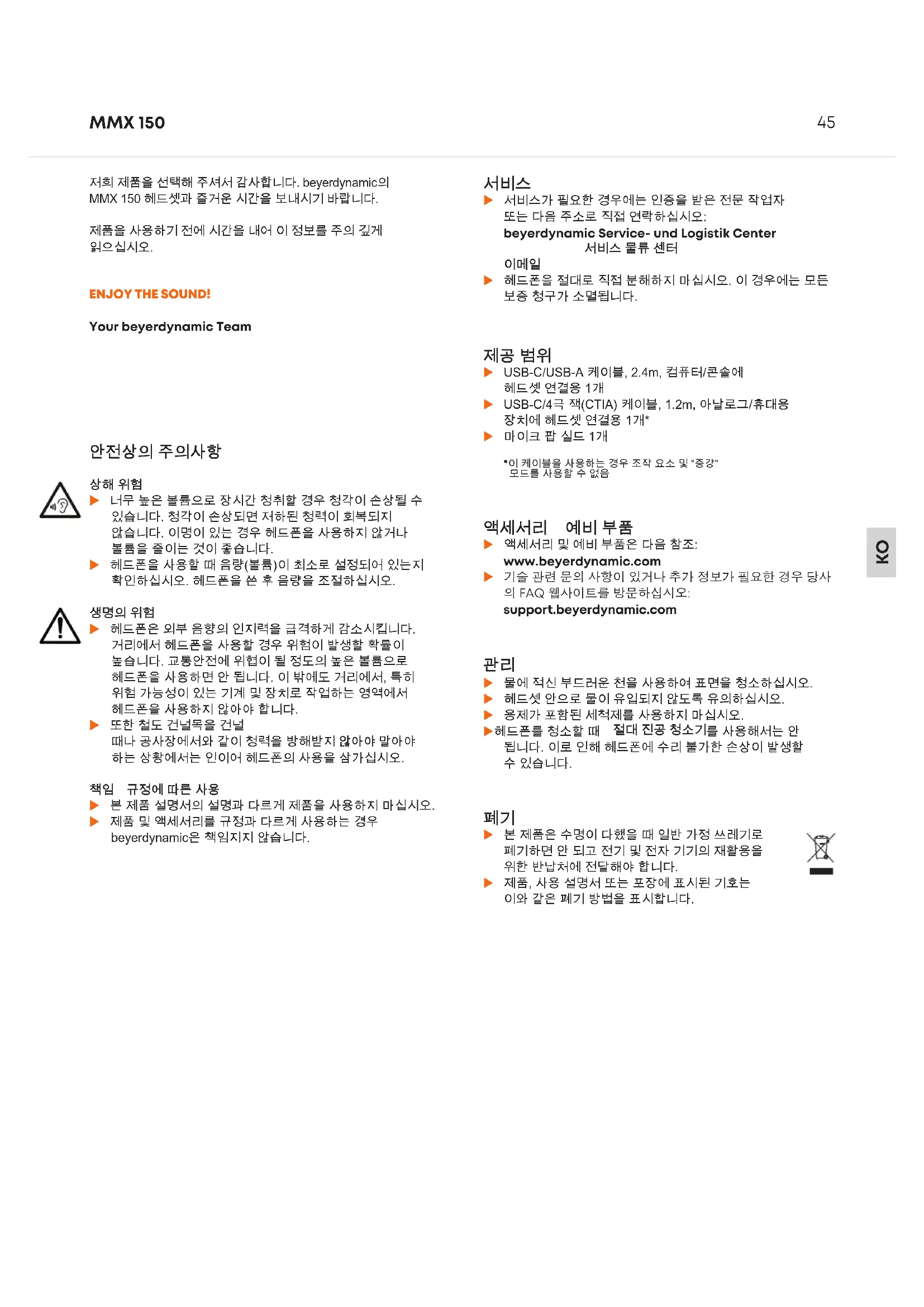 저희 제품을 선택해 주셔서 감사합니다. beyerdynamic의 MMX 150 헤드셋과 즐거운 시간을 보내시기 바랍니다. 제품을 사용하기 전에 시간을 내어 이 정보를 주의 깊게