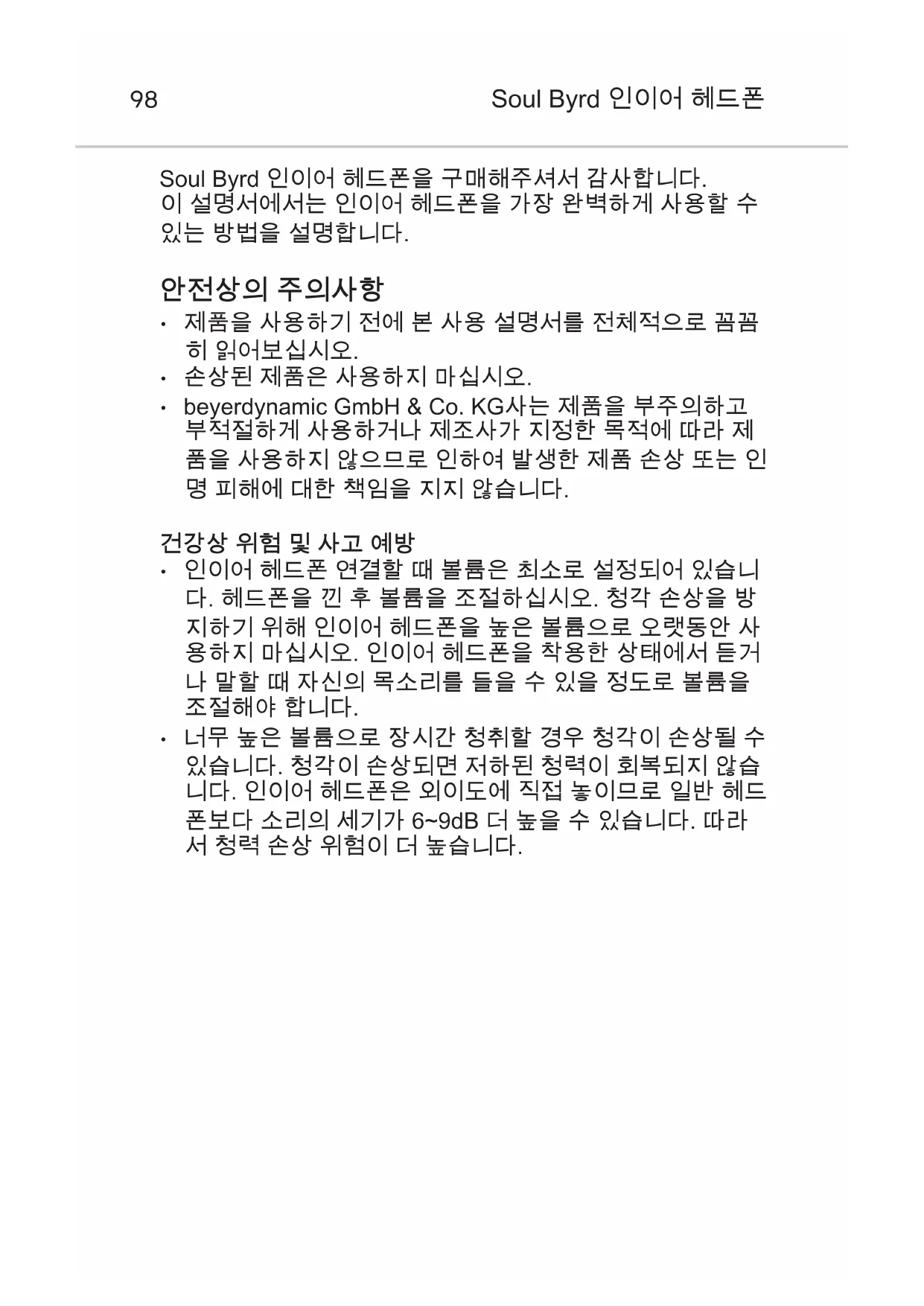 - 너무 높은 볼륨으로 장시간 청취할 경우 청각이 손상될 수 있습니다. 청각이 손상되면 저하된 청력이 회복되지 않습 니다. 인이어 헤드폰은 외이도에 직접 놓이므로 일반 헤드 폰보다 소리의 세기가 6~9dB 더 높을 수 있습니다. 따라 서 청력 손상 위험이 더 높습니다.한국어 Soul Byrd 인이어 헤드폰