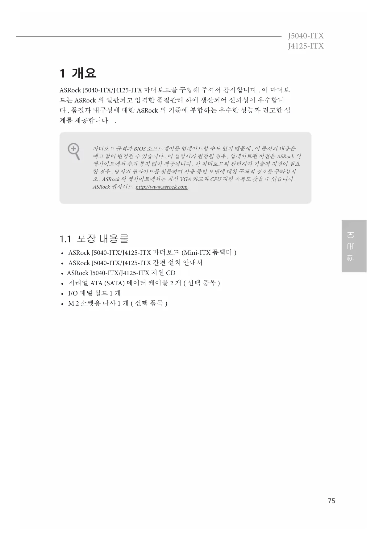 J5040-ITX J4125-ITX 1 개요 ASRock J5040-ITX/J4125-ITX 마더보드를 구입해 주셔서 감사합니다 . 이 마더보 드는 ASRock 의 일관되고 엄격한 품질관리 하에 생산되어 신뢰성이 우수합니 다 . 품질과 내구성에 대한 ASRock 의 기준에 부합하는 우수한 성능과 견고한 설