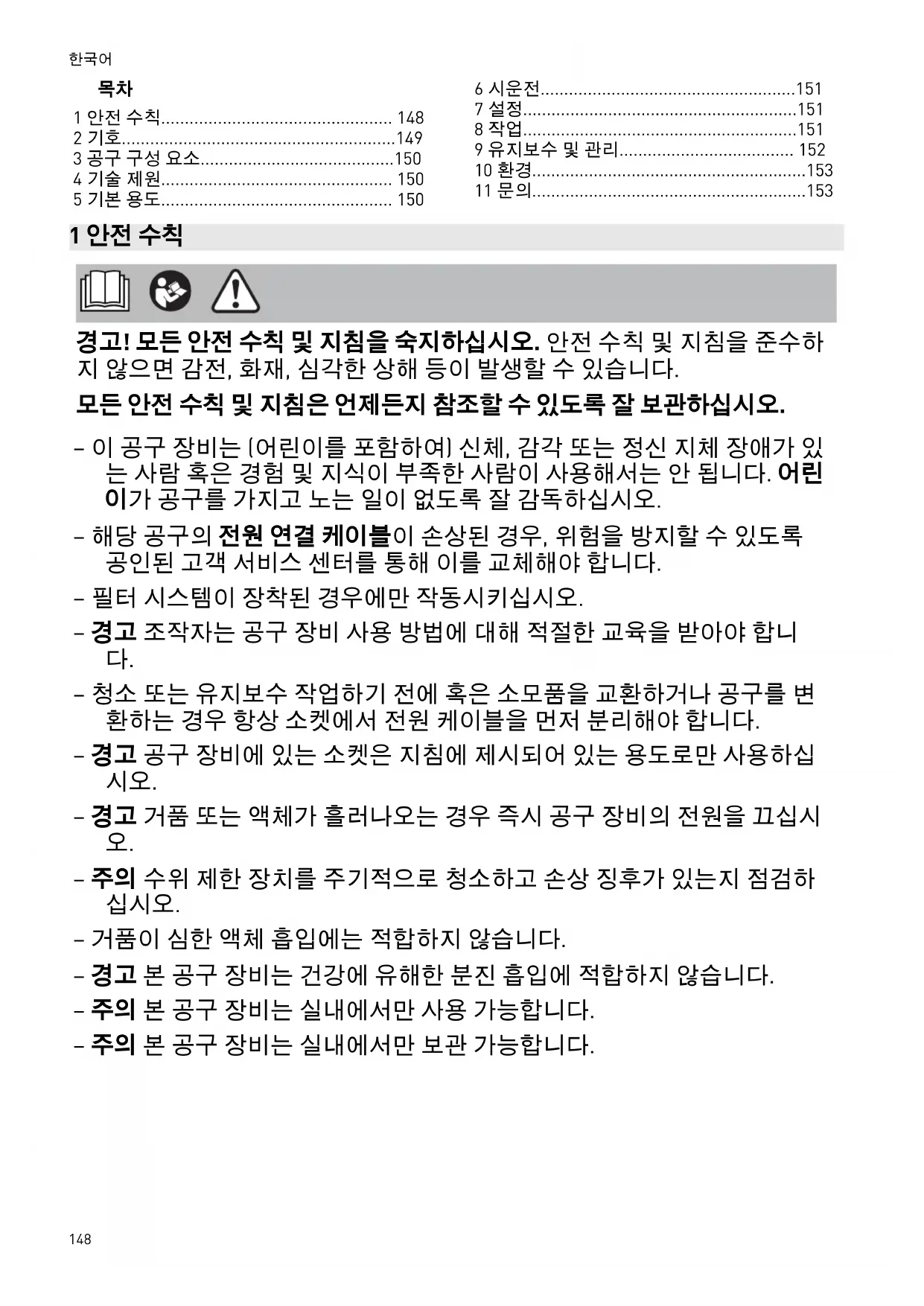 - 11 문의 1 안전 수칙 경고! 모든 안전 수칙 및 지침을 숙지하십시오. 안전 수칙 및 지침을 준수하 지 않으면 감전, 화재, 심각한 상해 등이 발생할 수 있습니다. 모든 안전 수칙 및 지침은 언제든지 참조할 수 있도록 잘 보관하십시오. – 이 공구 장비는 (어린이를 포함하여) 신체, 감각 또는 정신 지체 장애가 있 는 사람 혹은 경험 및 지식이 부족한 사람이 사용해서는 안 됩니다. 어린 이가 공구를 가지고 노는 일이 없도록 잘 감독하십시오. – 해당 공구의 전원 연결 케이블이 손상된 경우, 위험을 방지할 수 있도록 공인된 고객 서비스 센터를 통해 이를 교체해야 합니다. – 필터 시스템이 장착된 경우에만 작동시키십시오. – 경고 조작자는 공구 장비 사용 방법에 대해 적절한 교육을 받아야 합니 p. 153