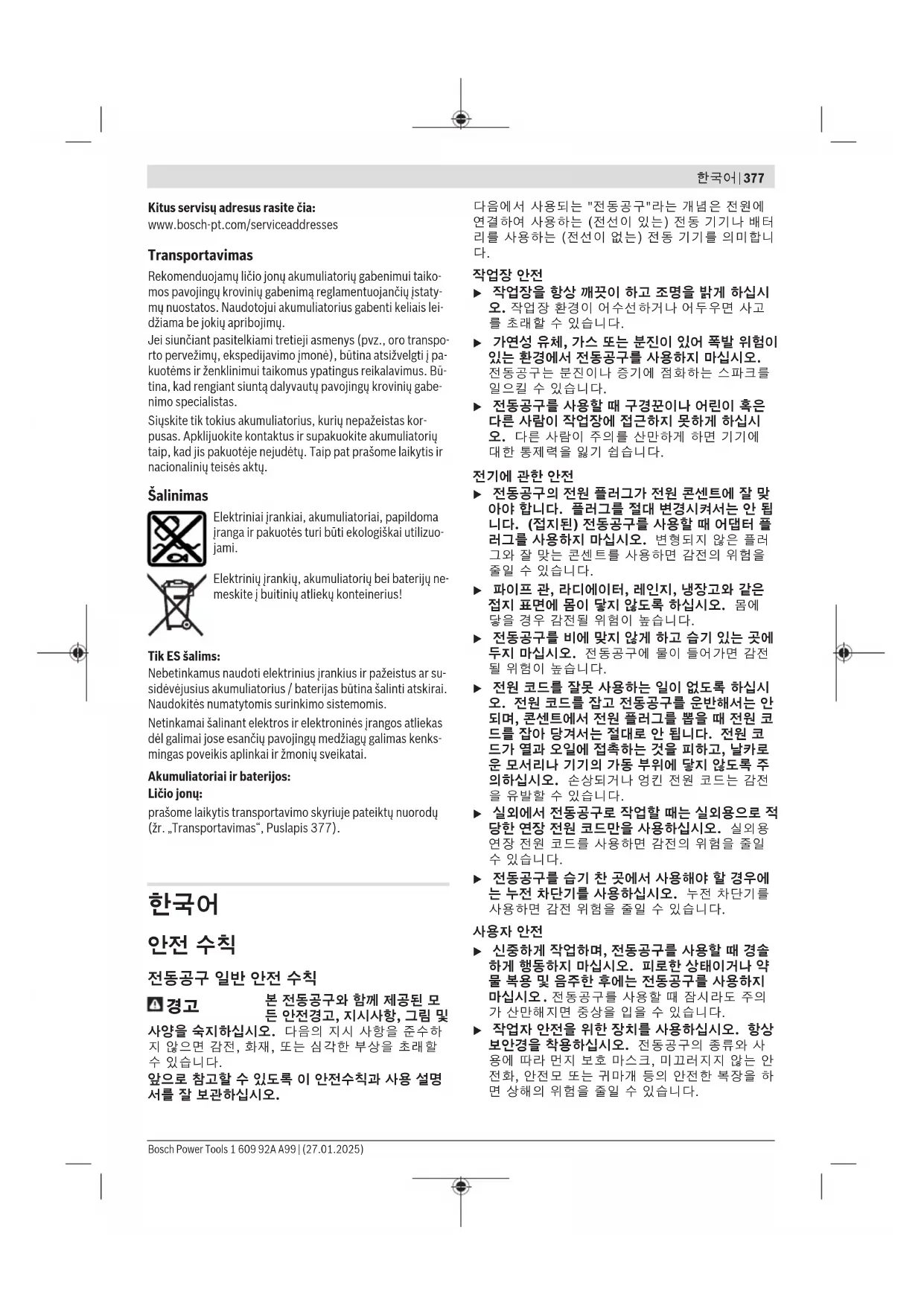 u 전동공구에 각종 작업(예: 유지보수, 공구 교체 등)을 진행하기 전에 항상 배터리를 전동공구에 서 분리하십시오. 실수로 전원 스위치가 작동하 게 되면 부상을 입을 위험이 있습니다. 지침기기가 작동 중에 연마석이 깨지거나 안전반이 나 전동공구에 있는 홀더 장치가 손상된 경우 전동 공구를 즉시 고객 서비스 센터에 보내야 합니다, "AS 센터 및 사용 문의" 단락에 나온 주소 참조. Bosch Power Tools 1 609 92A A99 | (27.01.2025)384 | 한국어