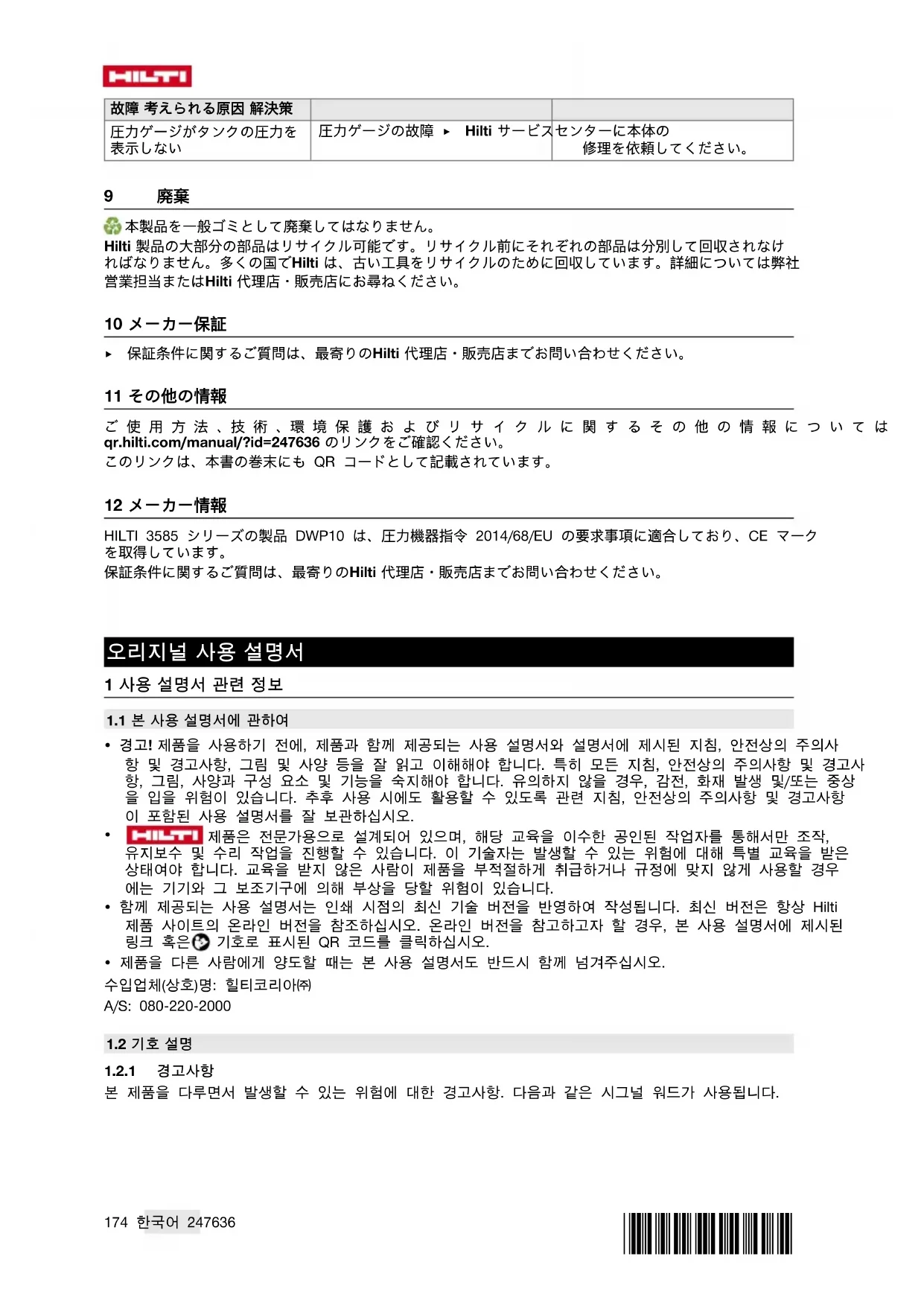 10 제조회사 보증 ▶ 보증 조건에 관한 질문사항은 현지 Hilti 파트너사에 문의하십시오. 11 기타 정보 작동법, 기술, 환경 및 재활용에 대한 세부 정보는 qr.hilti.com/manual/?id=247636에서 확인할 수 있습니다. 해당 링크는 본 문서 끝에 QR 코드 형식으로도 제시되어 있습니다. 12 생산 정보 3585 제품 사양의 HILTI DWP10 제품은 압력 설비 지침 2014/68/EU를 충족하며 CE 표시가 있습니다. 보증 조건에 관한 질문사항은 Hilti 파트너 지사에 문의하십시오.180 繁體中文 247636 *247636*