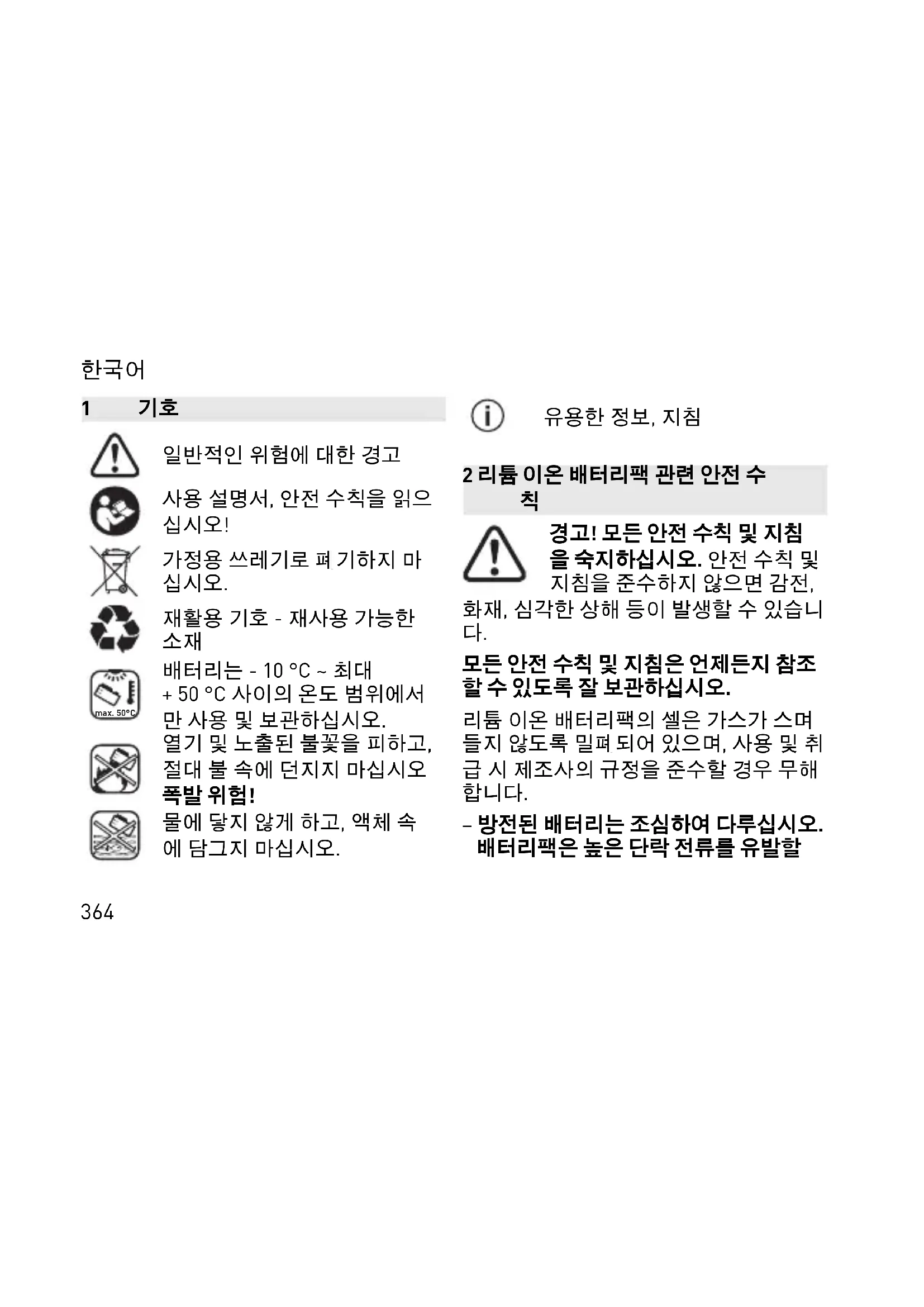 모든 안전 수칙 및 지침은 언제든지 참조 할 수 있도록 잘 보관하십시오. 리튬 이온 배터리팩의 셀은 가스가 스며 들지 않도록 밀폐되어 있으며, 사용 및 취 급 시 제조사의 규정을 준수할 경우 무해