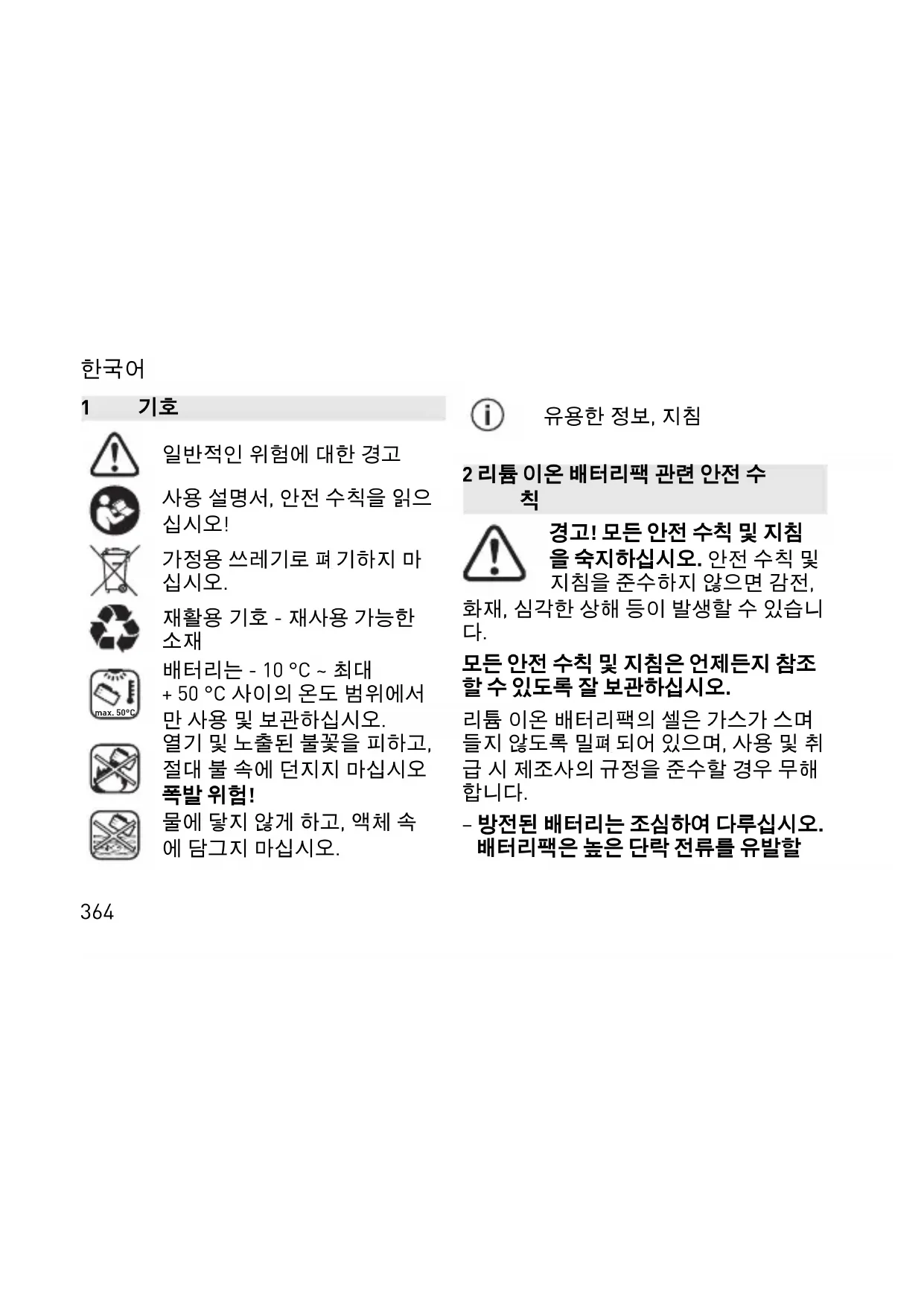 모든 안전 수칙 및 지침은 언제든지 참조 할 수 있도록 잘 보관하십시오. 리튬 이온 배터리팩의 셀은 가스가 스며 들지 않도록 밀폐되어 있으며, 사용 및 취 급 시 제조사의 규정을 준수할 경우 무해