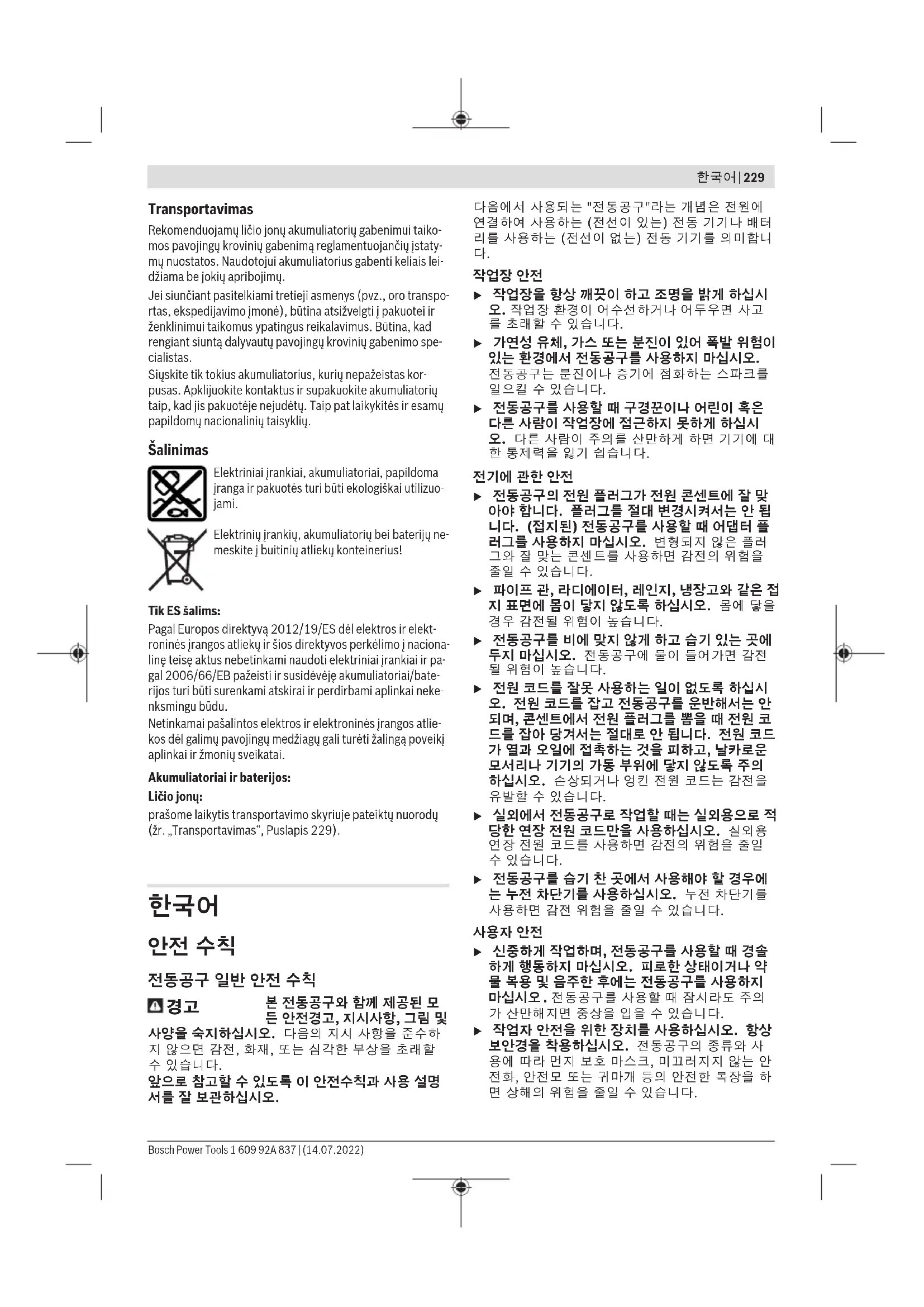 u KickBack Control 기능에 문제가 있으면, 전동 공구의 전원이 켜지지 않습니다. 전동공구의 수 리는 해당 자격을 갖춘 전문 인력에게 맡기고, 수 리 정비 시 순정 부품만 사용하십시오. 1 609 92A 837 | (14.07.2022) Bosch Power Tools한국어 | 235