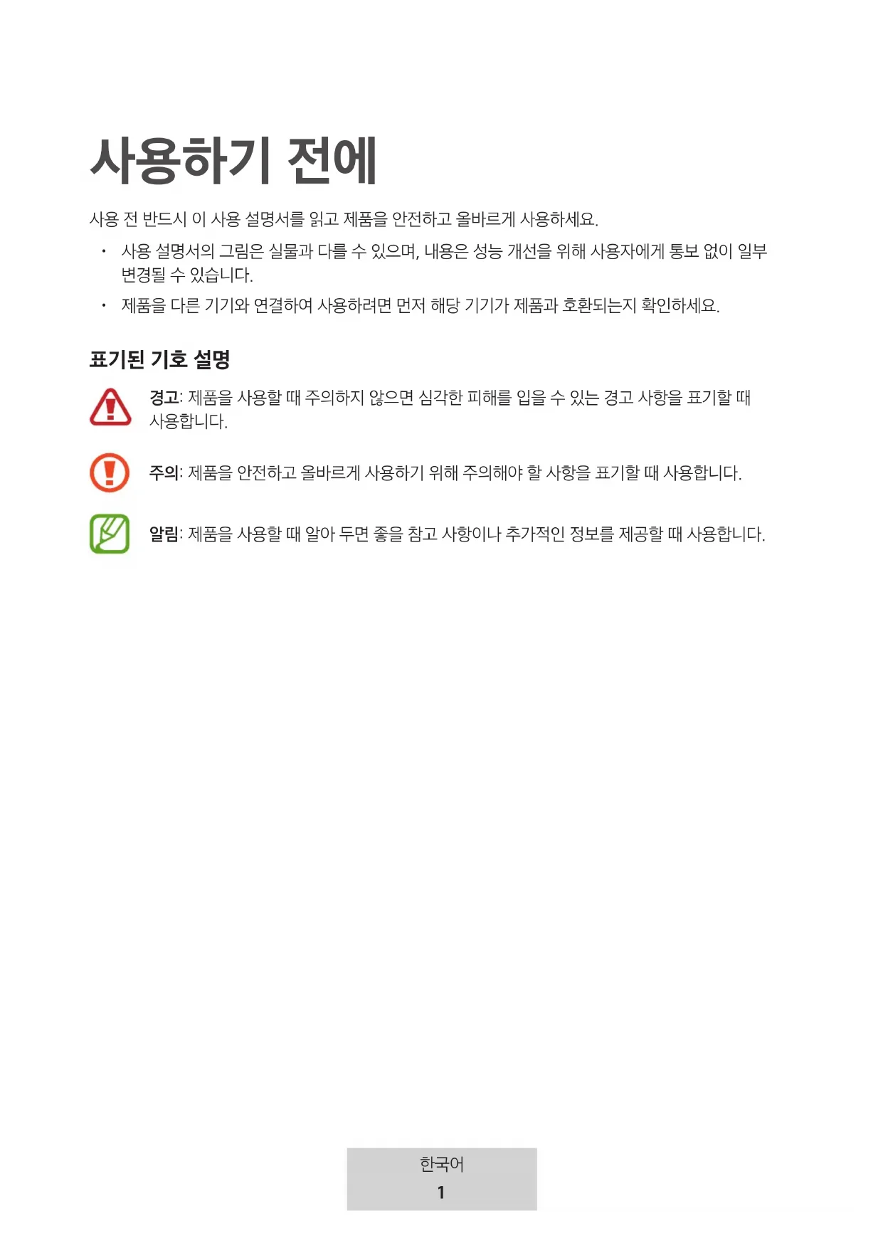 주의: 제품을 안전하고 올바르게 사용하기 위해 주의해야 할 사항을 표기할 때 사용합니다. 알림: 제품을 사용할 때 알아 두면 좋을 참고 사항이나 추가적인 정보를 제공할 때 사용합니다.2