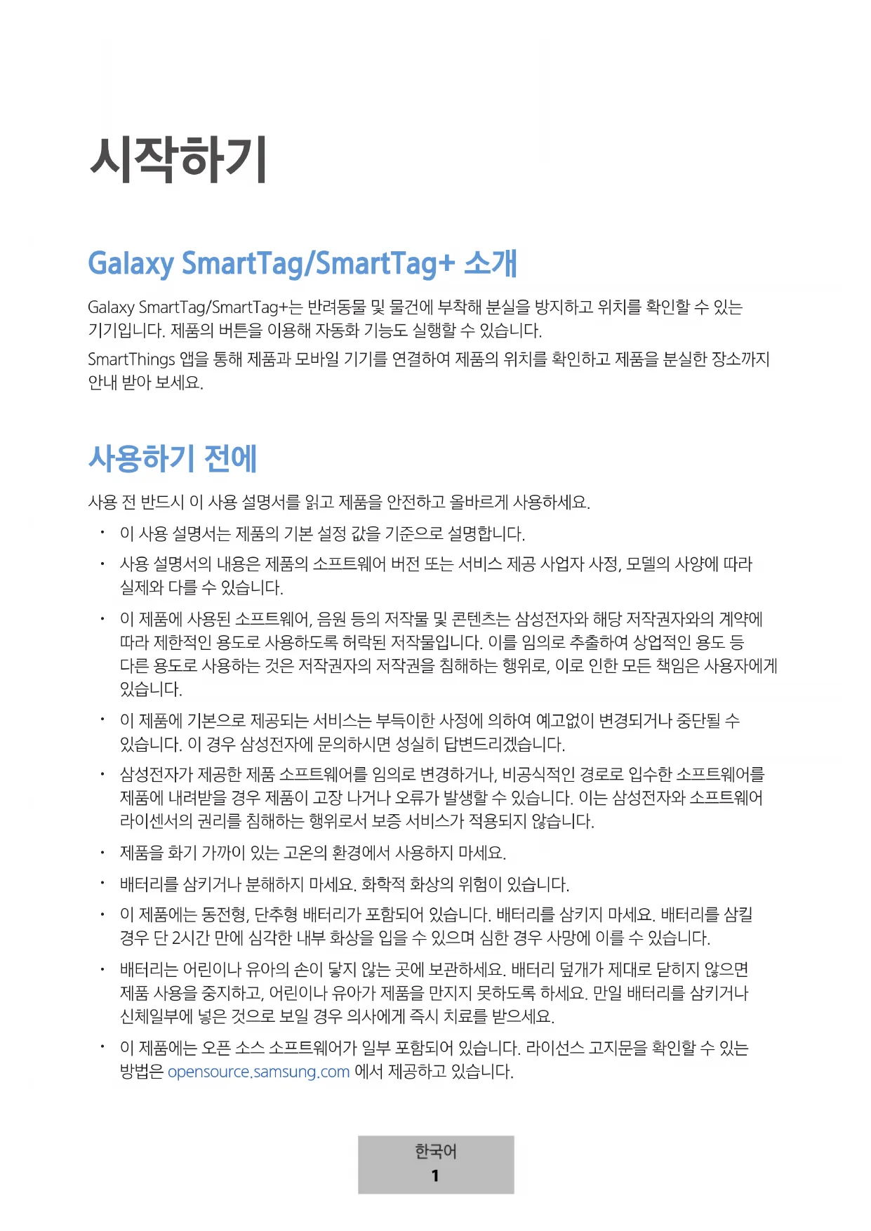 Galaxy SmartTag/SmartTag+ 소개 Galaxy SmartTag/SmartTag+는 반려동물 및 물건에 부착해 분실을 방지하고 위치를 확인할 수 있는 기기입니다. 제품의 버튼을 이용해 자동화 기능도 실행할 수 있습니다. SmartThings 앱을 통해 제품과 모바일 기기를 연결하여 제품의 위치를 확인하고 제품을 분실한 장소까지