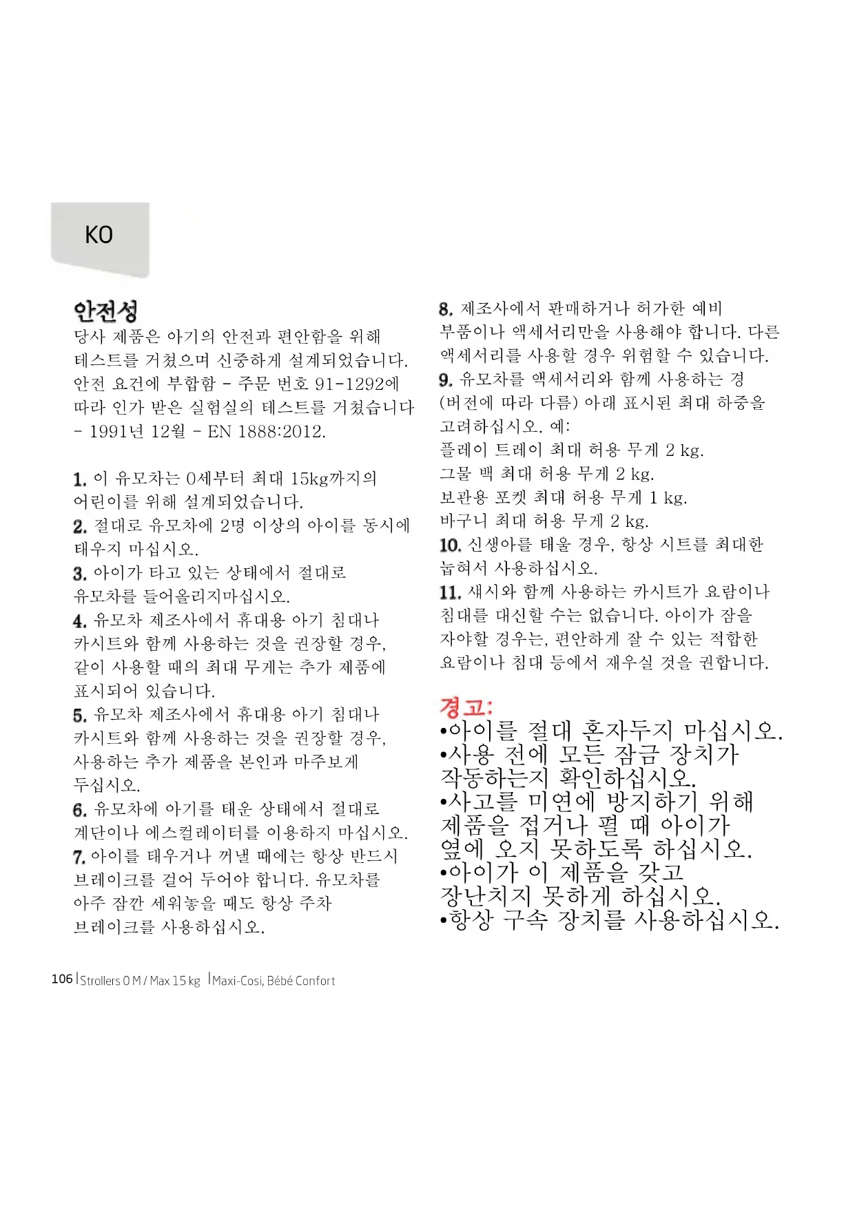 당사 제품은 아기의 안전과 편안함을 위해 테스트를 거쳤으며 신중하게 설계되었습니다. 안전 요건에 부합함 - 주문 번호 91-1292에 따라 인가 받은 실험실의 테스트를 거쳤습니다 - 1991년 12월 - EN 1888:2012.