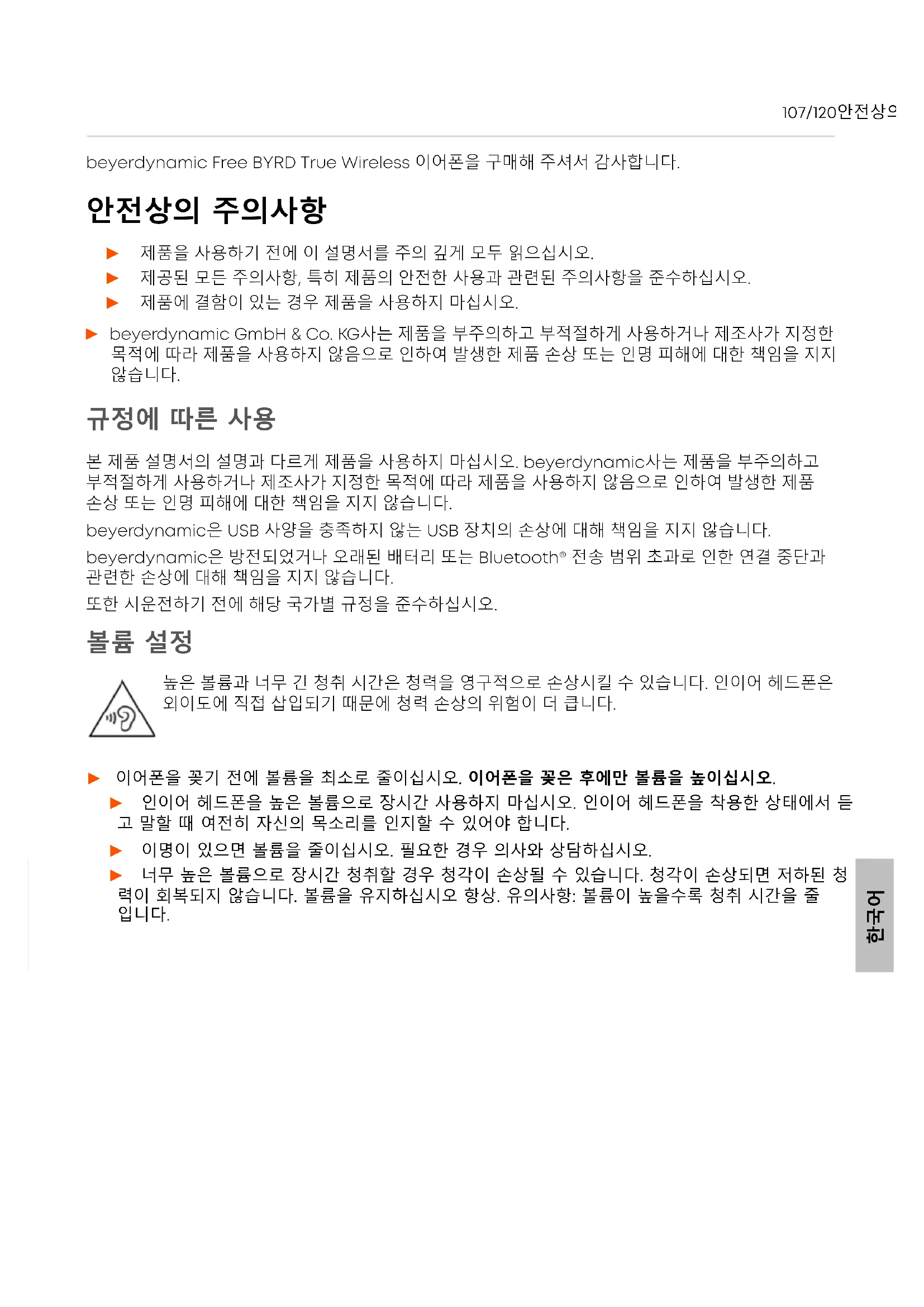 본 제품 설명서의 설명과 다르게 제품을 사용하지 마십시오. beyerdynamic사는 제품을 부주의하고 부적절하게 사용하거나 제조사가 지정한 목적에 따라 제품을 사용하지 않음으로 인하여 발생한 제품 손상 또는 인명 피해에 대한 책임을 지지 않습니다. beyerdynamic은 USB 사양을 충족하지 않는 USB 장치의 손상에 대해 책임을 지지 않습니다. beyerdynamic은 방전되었거나 오래된 배터리 또는 Bluetooth® 전송 범위 초과로 인한 연결 중단과 관련한 손상에 대해 책임을 지지 않습니다. 또한 시운전하기 전에 해당 국가별 규정을 준수하십시오.