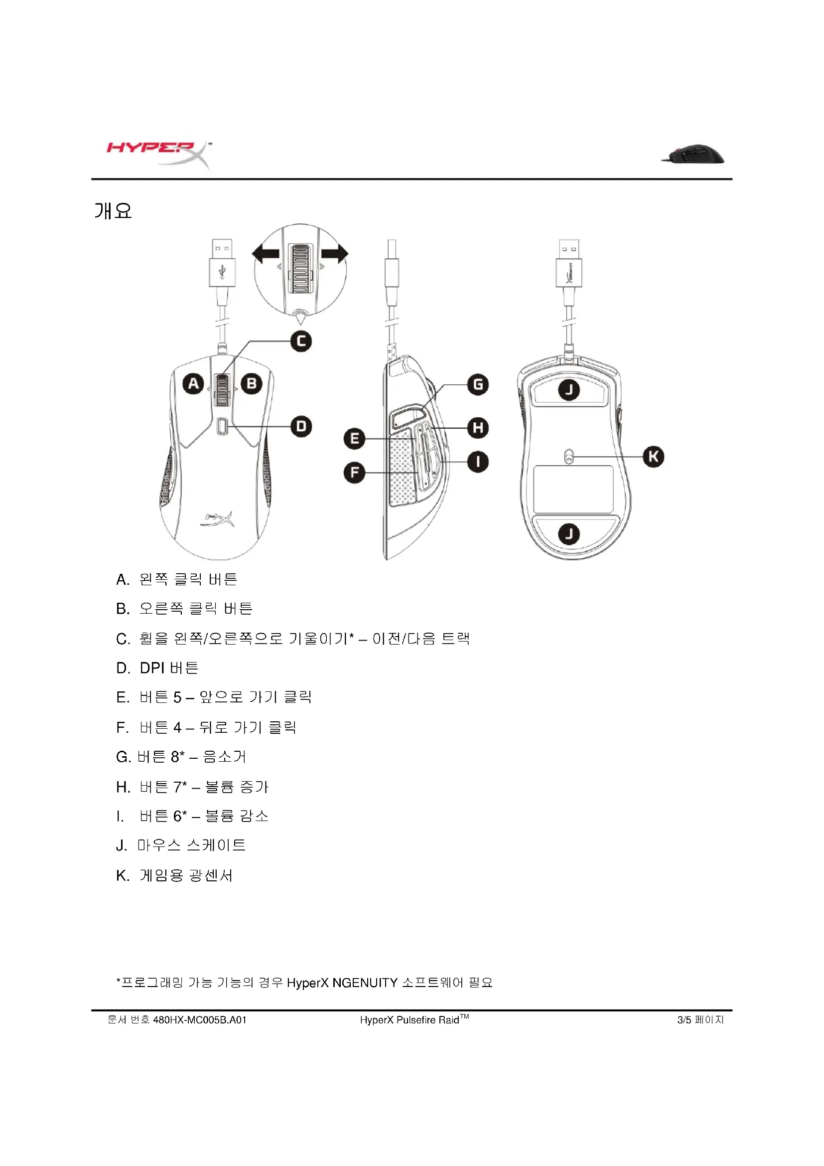 *프로그래밍 가능 기능의 경우 HyperX NGENUITY 소프트웨어 필요문서 번호 480HX-MC005B.A01 HyperX Pulsefire Raid