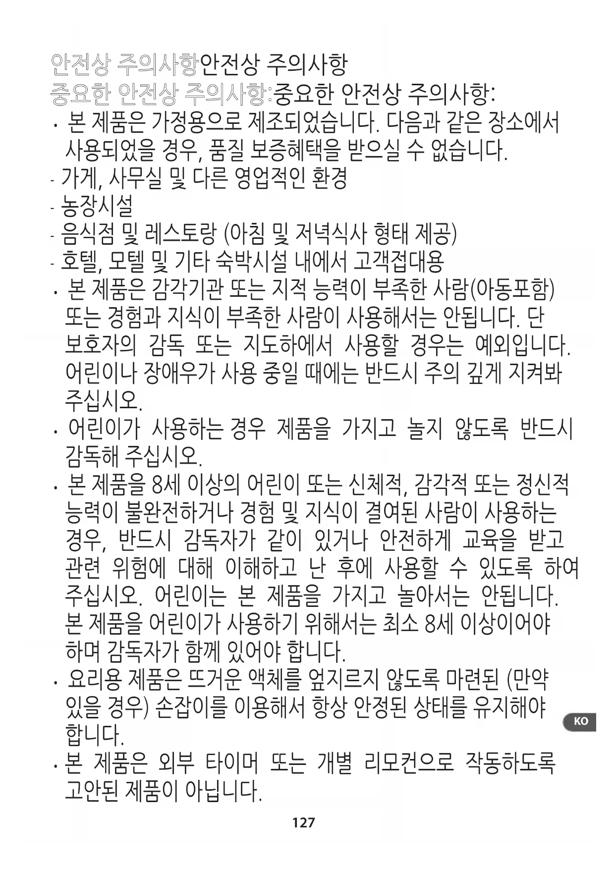- 본 제품을 8세 이상의 어린이 또는 신체적, 감각적 또는 정신적 능력이 불완전하거나 경험 및 지식이 결여된 사람이 사용하는 경우, 반드시 감독자가 같이 있거나 안전하게 교육을 받고 관련 위험에 대해 이해하고 난 후에 사용할 수 있도록 하여 주십시오. 어린이는 본 제품을 가지고 놀아서는 안됩니다. 본 제품을 어린이가 사용하기 위해서는 최소 8세 이상이어야 하며 감독자가 함께 있어야 합니다.