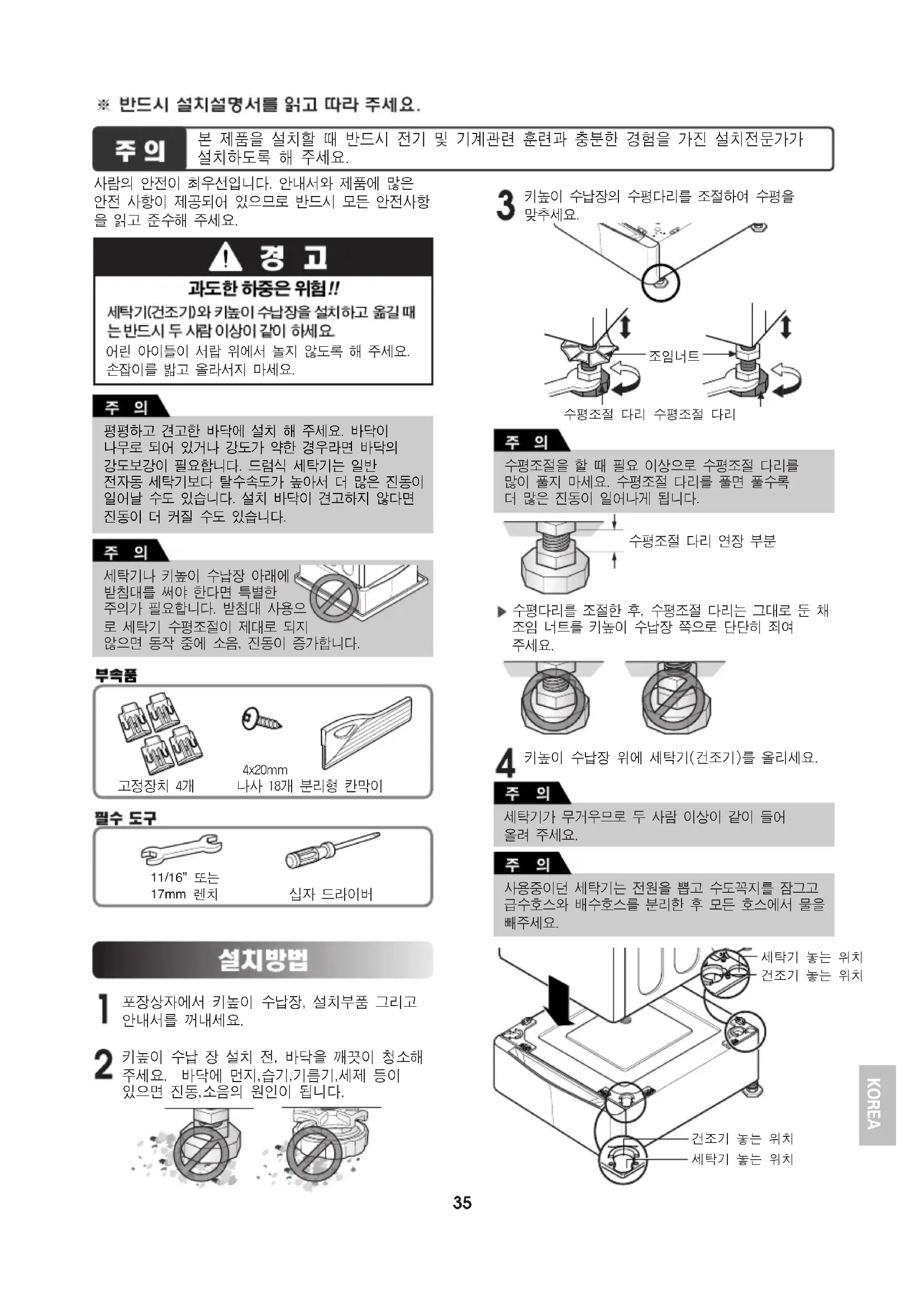 수평조절 다리 수평조절 다리 KOREA37 세탁기가 무거우므로 두 사람 이상이 같이 들어 올려