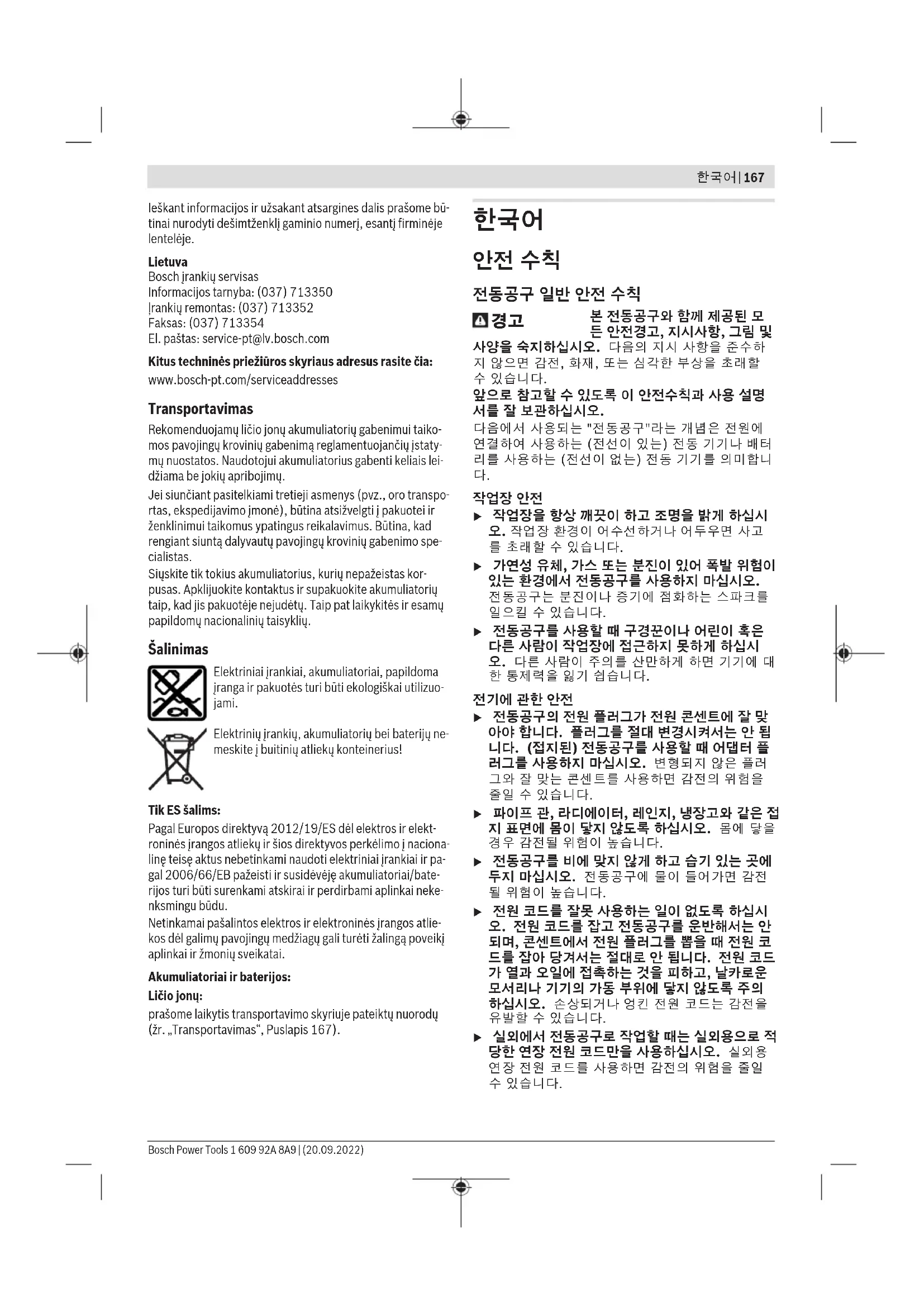 u 기술자료에 기재되어 있는 충전기만 사용하십시 오. 귀하의 전동공구에 사용된 리튬이온 배터리 에 맞춰진 충전기들입니다. 지침: 리튬 이온 배터리는 국제 운송 규정에 따라 일 부만 충전되에 출고됩니다. 배터리의 성능을 완전하 Bosch Power Tools 1 609 92A 8A9 | (20.09.2022)170 | 한국어 게 보장하기 위해서는 처음 사용하기 전에 배터리를 완전히 충전하십시오.