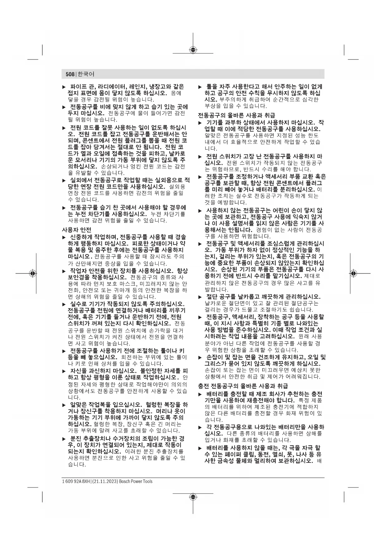 Bosch Power Tools 1 609 92A 8XH | (21.11.2023)508 | 한국어 u 파이프 관, 라디에이터, 레인지, 냉장고와 같은 접지 표면에 몸이 닿지 않도록 하십시오. 몸에 닿을 경우 감전될 위험이 높습니다. u 전동공구를 비에 맞지 않게 하고 습기 있는 곳에 두지 마십시오. 전동공구에 물이 들어가면 감전 될 위험이 높습니다. u 전원 코드를 잘못 사용하는 일이 없도록 하십시 오. 전원 코드를 잡고 전동공구를 운반해서는 안 되며, 콘센트에서 전원 플러그를 뽑을 때 전원 코 드를 잡아 당겨서는 절대로 안 됩니다. 전원 코 드가 열과 오일에 접촉하는 것을 피하고, 날카로 운 모서리나 기기의 가동 부위에 닿지 않도록 주 의하십시오. 손상되거나 엉킨 전원 코드는 감전 을 유발할 수 있습니다. u 실외에서 전동공구로 작업할 때는 실외용으로 적 당한 연장 전원 코드만을 사용하십시오. 실외용 연장 전원 코드를 사용하면 감전의 위험을 줄일