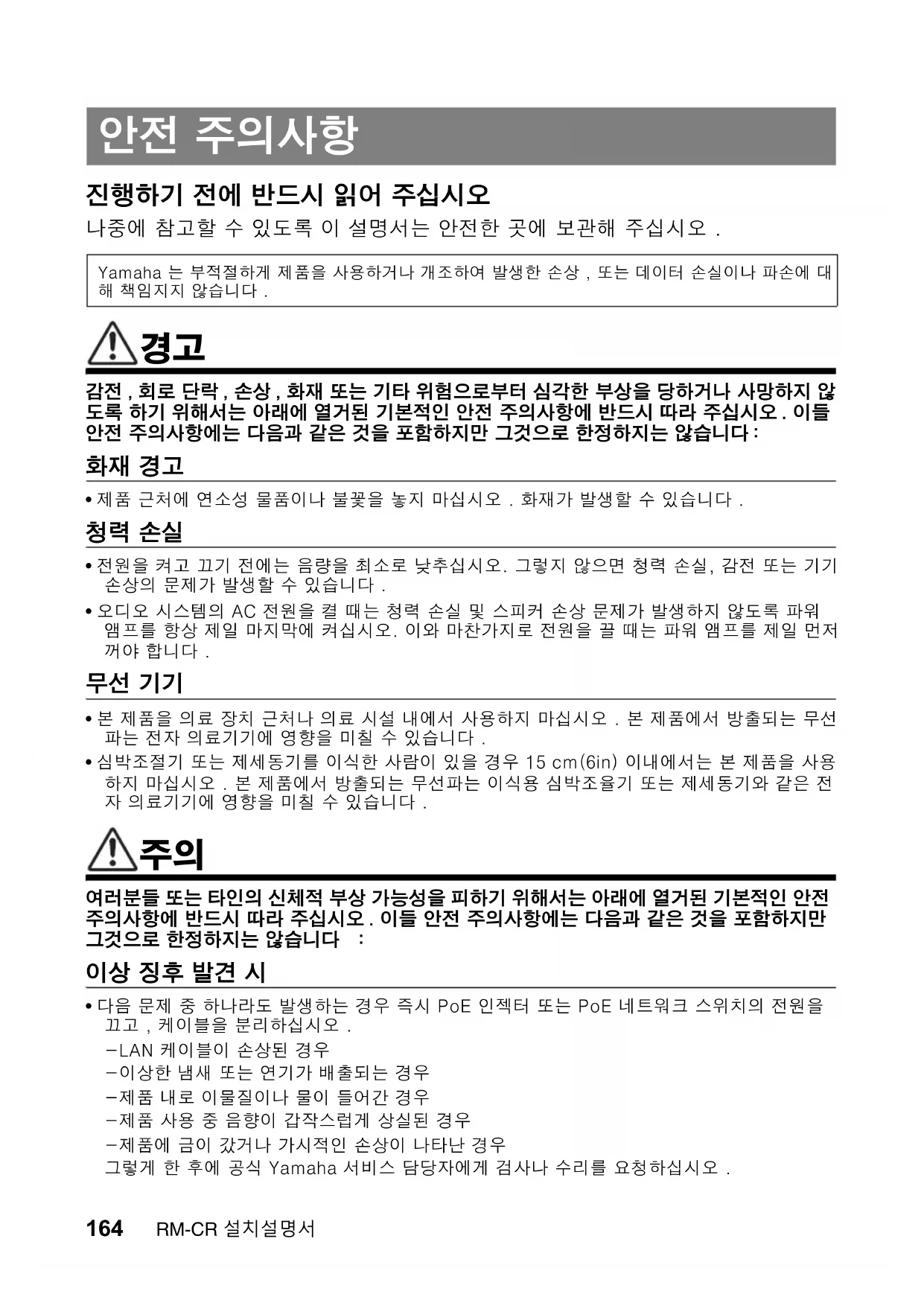 - 다음 문제 중 하나라도 발생하는 경우 즉시 PoE 인젝터 또는 PoE 네트워크 스위치의 전원을 끄고 , 케이블을 분리하십시오 .-LAN 케이블이 손상된 경우-이상한 냄새 또는 연기가 배출되는 경우-제품 내로 이물질이나 물이 들어간 경우-제품 사용 중 음향이 갑작스럽게 상실된 경우-제품에 금이 갔거나 가시적인 손상이 나타난 경우그렇게 한 후에 공식 Yamaha 서비스 담당자에게 검사나 수리를 요청하십시오 . Yamaha 는 부적절하게 제품을 사용하거나 개조하여 발생한 손상 , 또는 데이터 손실이나 파손에 대해 책임지지 않습니다 .한국어