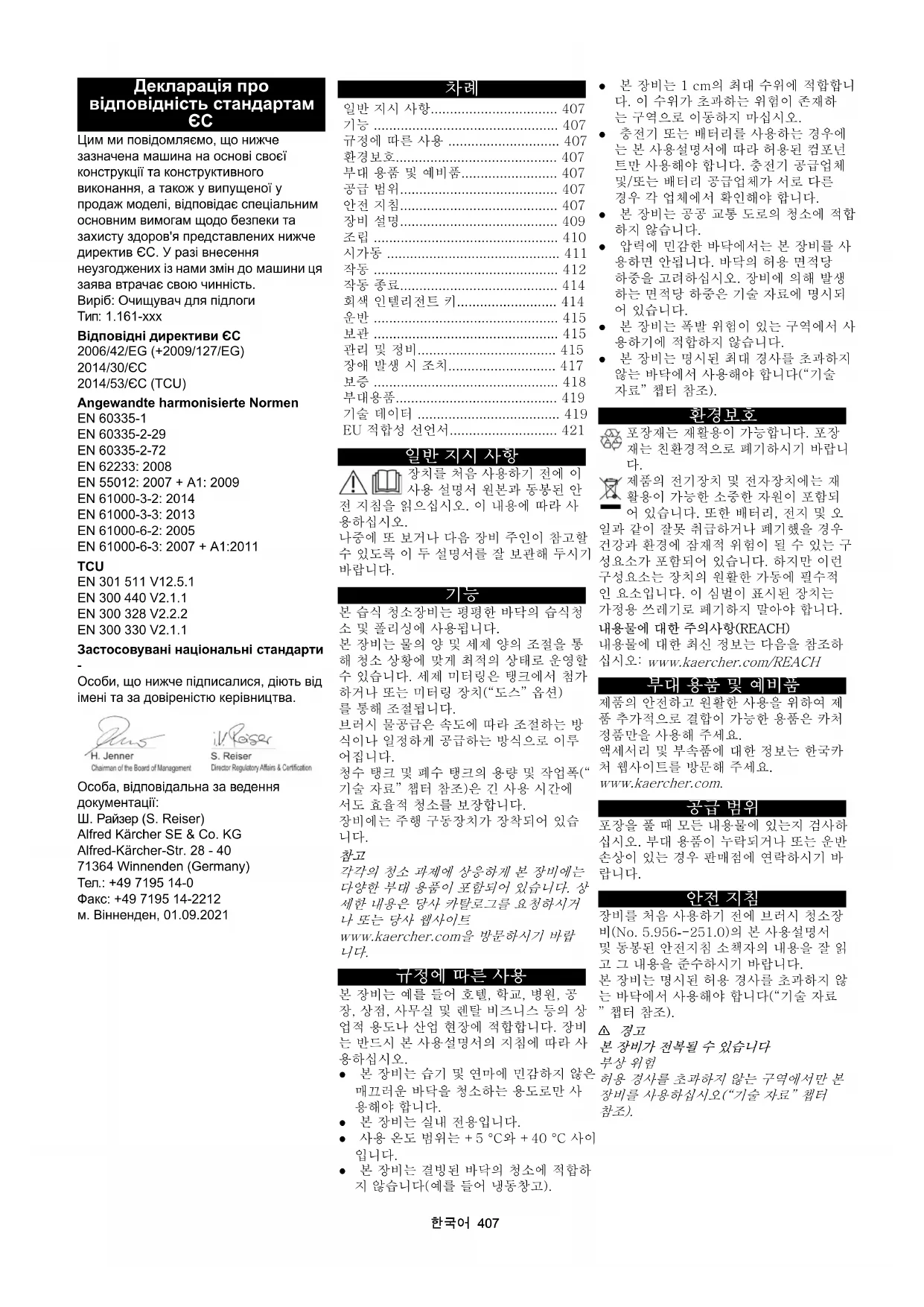 www.kaercher.com/REACH 부대 용품 및 예비품 제품의 안전하고 원활한 사용을 위하여 제 품 추가적으로 결합이 가능한 용품은 카처 정품만을 사용해 주세요. 액세서리 및 부속품에 대한 정보는 한국카 처 웹사이트를 방문해 주세요. www.kaercher.com