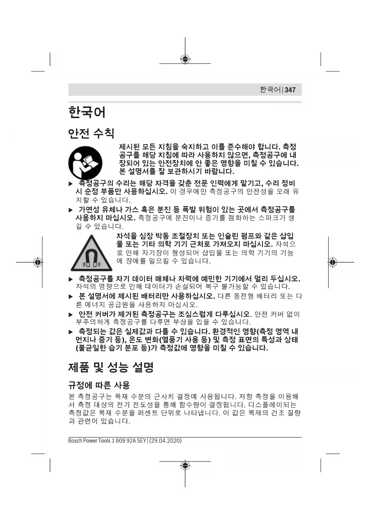 자석을 심장 박동 조절장치 또는 인슐린 펌프와 같은 삽입 물 또는 기타 의학 기기 근처로 가져오지 마십시오. 자석으 로 인해 자기장이 형성되어 삽입물 또는 의학 기기의 기능 에 장애를 일으킬 수 있습니다. u 측정공구를 자기 데이터 매체나 자력에 예민한 기기에서 멀리 두십시오. 자석의 영향으로 인해 데이터가 손실되어 복구 불가능할 수 있습니다. u 본 설명서에 제시된 배터리만 사용하십시오. 다른 동전형 배터리 또는 다 른 에너지 공급원을 사용하지 마십시오. u 안전 커버가 제거된 측정공구는 조심스럽게 다루십시오. 안전 커버 없이 부주의하게 측정공구를 다루면 부상을 입을 수 있습니다. u 측정되는 값은 실제값과 다를 수 있습니다. 환경적인 영향(측정 영역 내 먼지나 증기 등), 온도 변화(열풍기 사용 등) 및 측정 표면의 특성과 상태 (불균일한 습기 분포 등)가 측정값에 영향을 미칠 수 있습니다.