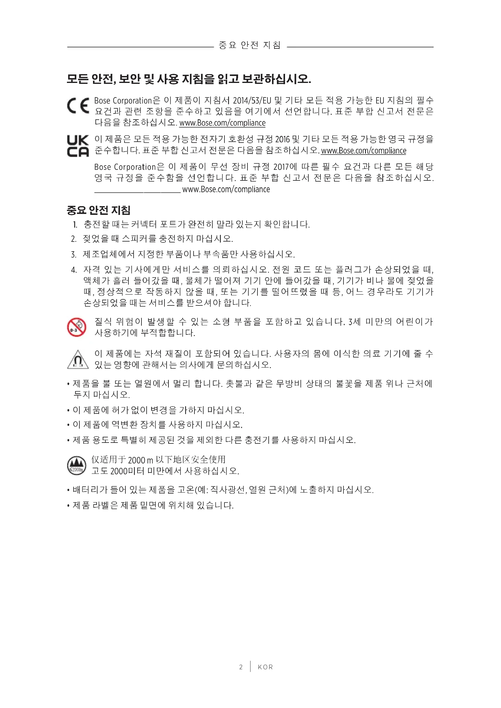 KOR 모든 안전, 보안 및 사용 지침을 읽고 보관하십시오. Bose Corporation은 이 제품이 지침서 2014/53/EU 및 기타 모든 적용 가능한 EU 지침의 필수 요건과 관련 조항을 준수하고 있음을 여기에서 선언합니다. 표준 부합 신고서 전문은 다음을 참조하십시오. www.Bose.com/compliancewww.Bose.com/compliance 이 제품은 모든 적용 가능한 전자기 호환성 규정 2016 및 기타 모든 적용 가능한 영국 규정을 준수합니다. 표준 부합 신고서 전문은 다음을 참조하십시오. www.Bose.com/compliancewww.Bose.com/compliance Bose Corporation은 이 제품이 무선 장비 규정 2017에 따른 필수 요건과 다른 모든 해당 영국 규정을 준수함을 선언합니다. 표준 부합 신고서 전문은 다음을 참조하십시오. www.Bose.com/compliancewww.Bose.com/compliance