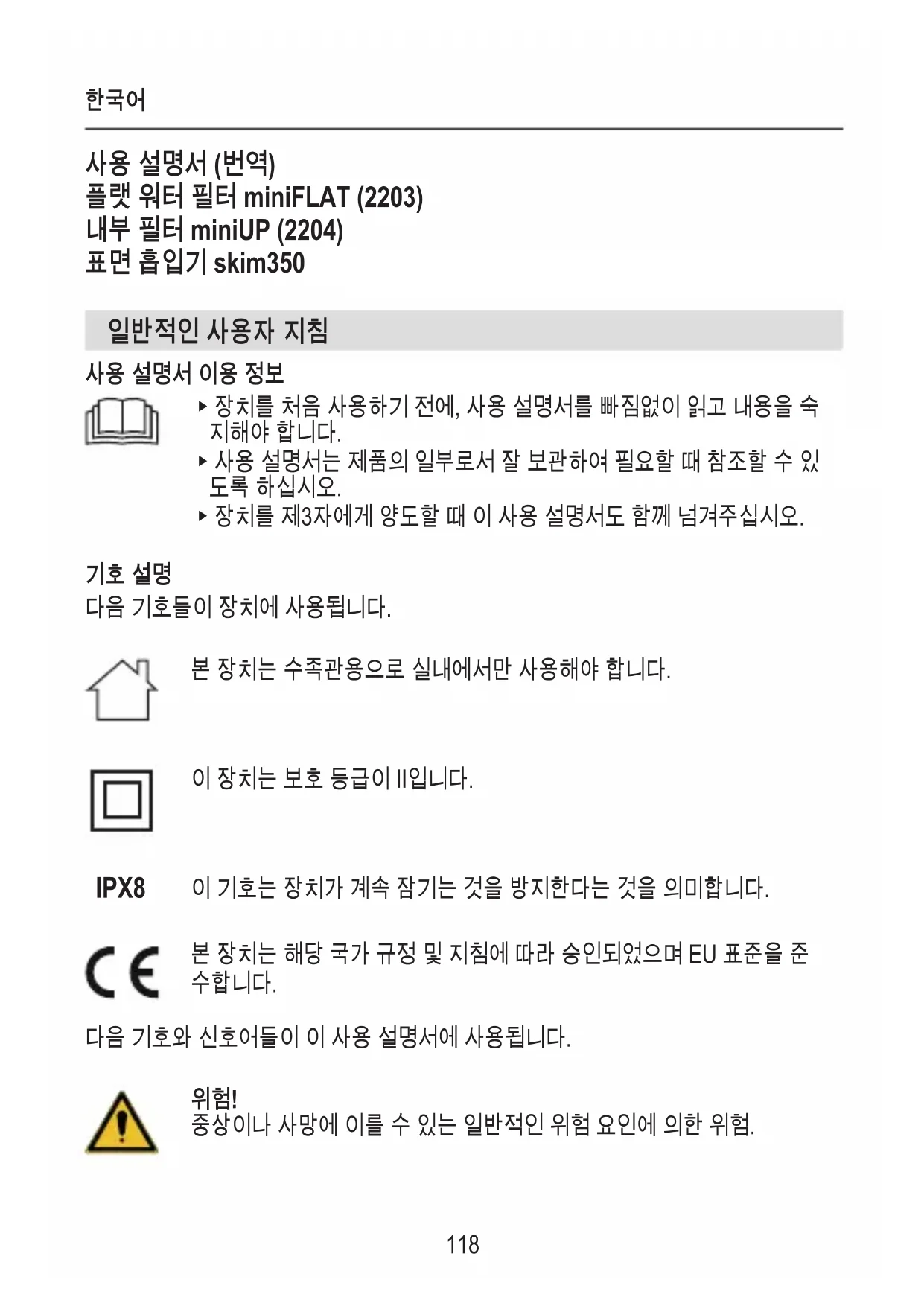사용 설명서 (번역) 플랫 워터 필터 miniFLAT (2203) 내부 필터 miniUP (2204) 표면 흡입기 skim350 일반적인 사용자 지침 사용 설명서 이용 정보 ▶ 장치를 처음 사용하기 전에, 사용 설명서를 빠짐없이 읽고 내용을 숙
