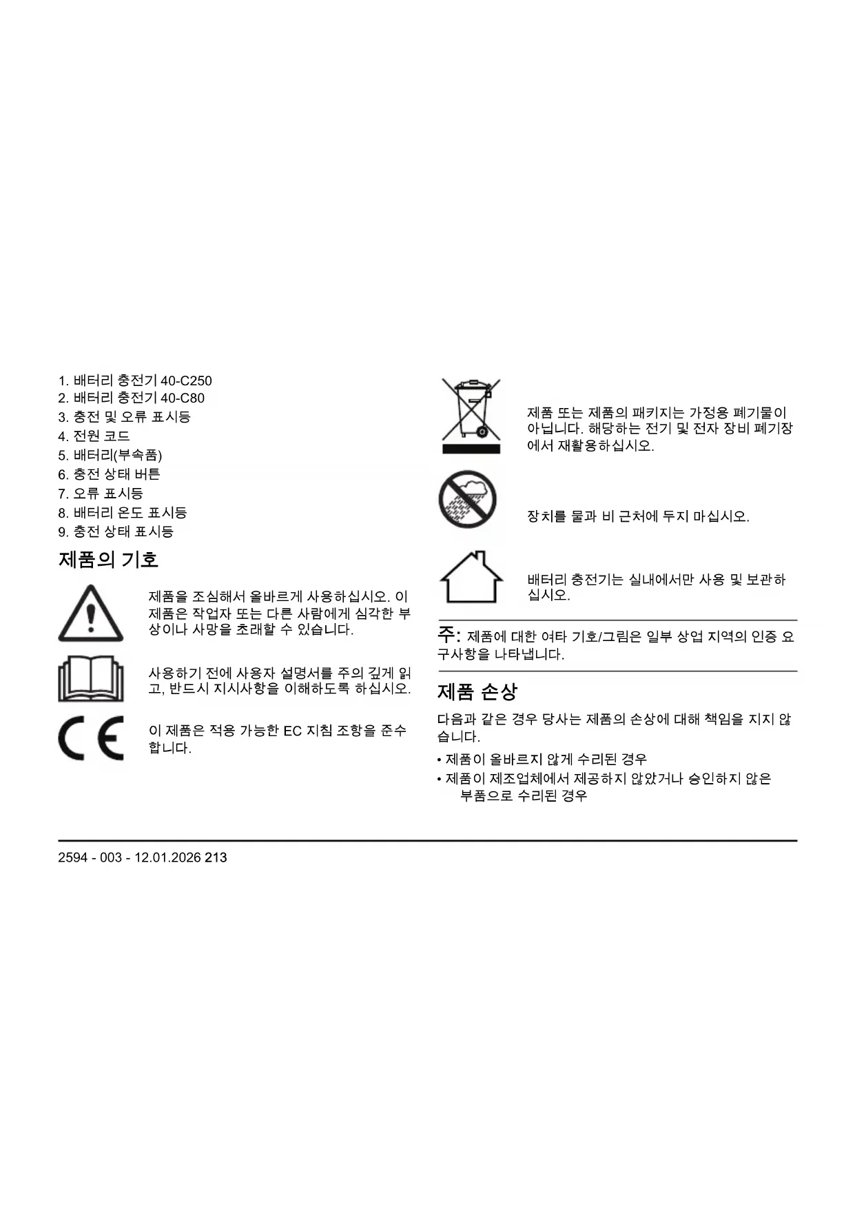 인화성 물질이나 부식성 물질 근 처에서 배터리 충전기를 사용하 지 마십시오. 연기 또는 불이 나 는 경우에는 배터리 충전기 전원 플러그를 분리하십시오. 216 2594 - 003 - 12.01.2026• 작동 중에는 배터리 충전기에 덮 개를 씌우지 마십시오.