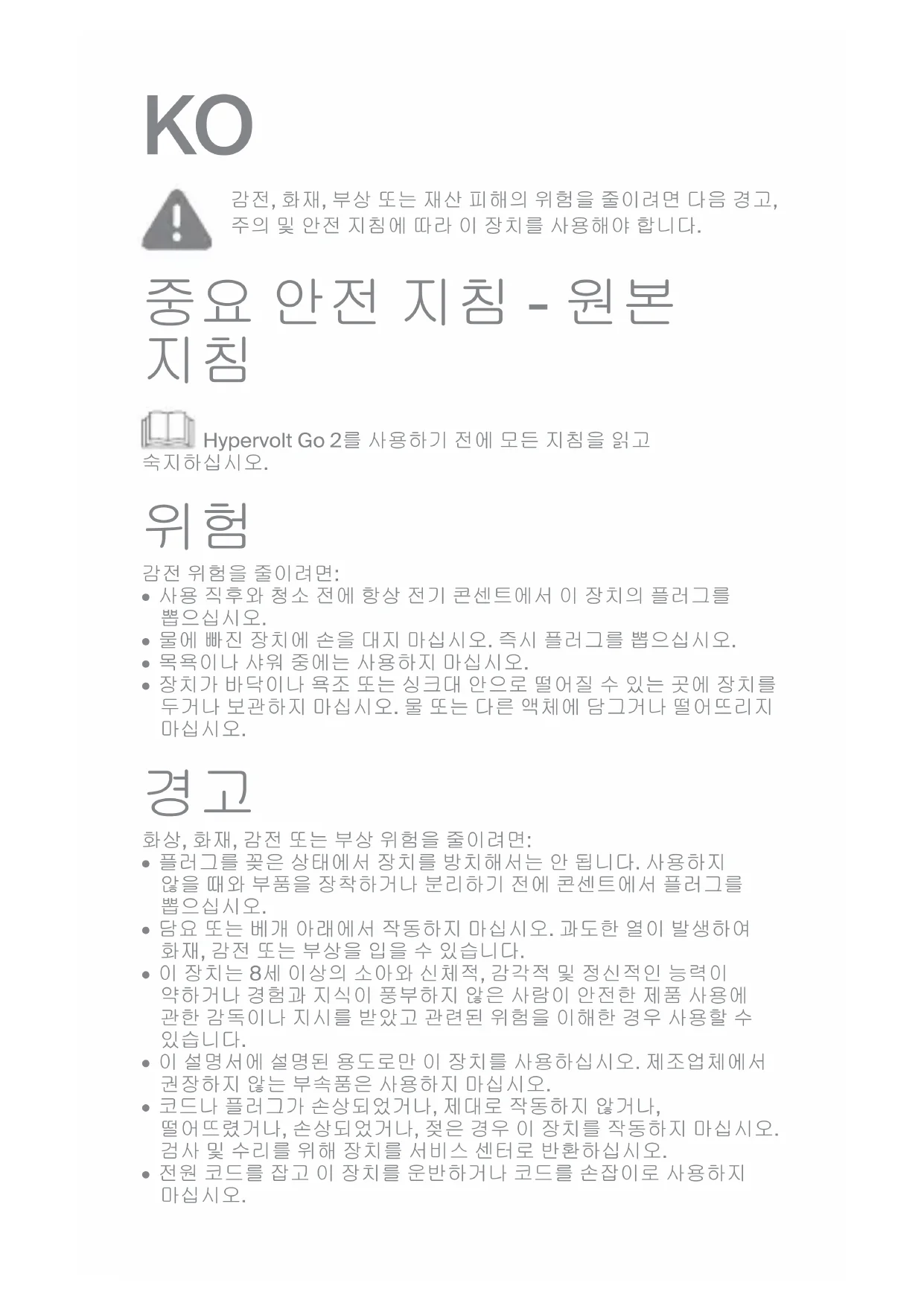 이 장치에 사용된 배터리를 잘못 취급하면 화재나 화학적 화상의 위험이 있습니다. 분해하거나 100℃ 이상으로 가열하거나 소각하지 마십시오. 소진된 배터리는 즉시 폐기하십시오. 아이들의 손이 닿지 않게 하십시오. 분해하거나 불 속에 폐기하지 마십시오. 이 지침을 보관하십시오. Hypervolt Go 2는 휴대용 타진 마사지 장치로서 근육을 이완하고, 긴장을 완화하고, 편안한 마사지를 제공하고, 워밍업 및 회복 속도를 높이고, 유연성과 동작 범위를 유지하는 데 도움이 되는 목표 압력