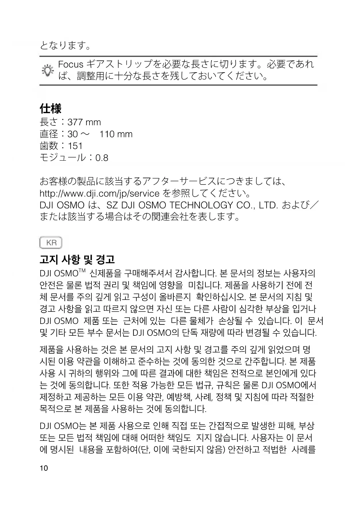 신제품을 구매해주셔서 감사합니다. 본 문서의 정보는 사용자의 안전은 물론 법적 권리 및 책임에 영향을 미칩니다. 제품을 사용하기 전에 전 체 문서를 주의 깊게 읽고 구성이 올바른지 확인하십시오. 본 문서의 지침 및 경고 사항을 읽고 따르지 않으면 자신 또는 다른 사람이 심각한 부상을 입거나 DJI OSMO 제품 또는 근처에 있는 다른 물체가 손상될 수 있습니다. 이 문서 및 기타 모든 부수 문서는 DJI OSMO의 단독 재량에 따라 변경될 수 있습니다. 제품을 사용하는 것은 본 문서의 고지 사항 및 경고를 주의 깊게 읽었으며 명 시된 이용 약관을 이해하고 준수하는 것에 동의한 것으로 간주합니다. 본 제품 사용 시 귀하의 행위와 그에 따른 결과에 대한 책임은 전적으로 본인에게 있다 는 것에 동의합니다. 또한 적용 가능한 모든 법규, 규칙은 물론 DJI OSMO에서 제정하고 제공하는 모든 이용 약관, 예방책, 사례, 정책 및 지침에 따라 적절한 목적으로 본 제품을 사용하는 것에 동의합니다. DJI OSMO는 본 제품 사용으로 인해 직접 또는 간접적으로 발생한 피해, 부상 또는 모든 법적 책임에 대해 어떠한 책임도 지지 않습니다. 사용자는 이 문서 에 명시된 내용을 포함하여(단, 이에 국한되지 않음) 안전하고 적법한 사례를11