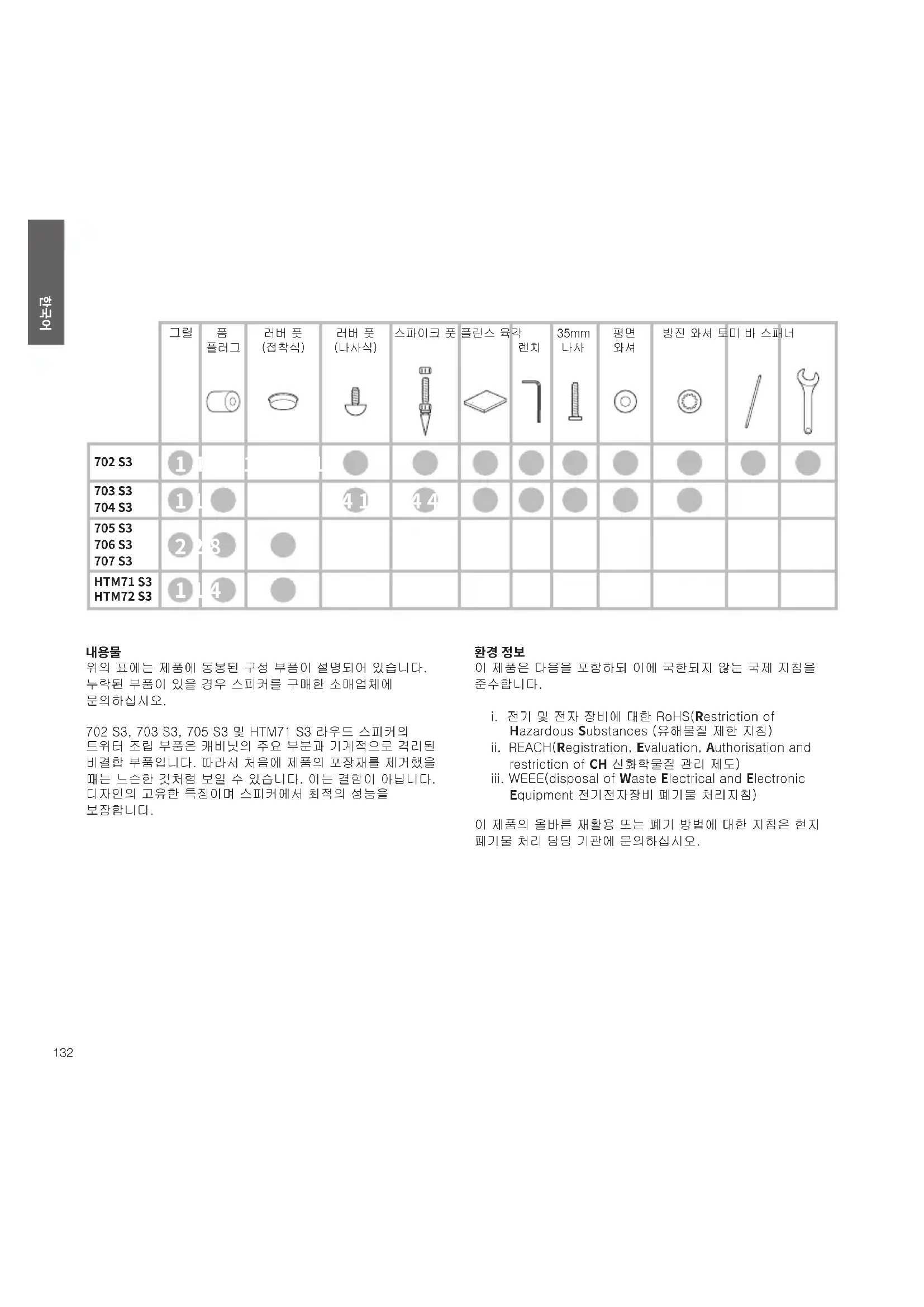 這是一款注重安裝的高性能產品,因此我們建議您在開始之前 花一些時間閱讀本手冊。在第 116 頁繼續 Bowers & Wilkins의 창립자 John Bowers는 가정에서 오디오를 제대로 즐기기 위한 핵심 요소는 창의적인 디자인, 혁신적인 엔지니어링 및 고급 기술이라고 생각했습니다. 디자인하는 모든 제품을 공유하고 영감을 불어넣는 노력을 계속해야 한다는 것이 그의 신념입니다. 본 제품은 설치 시 주의가 필요한 고성능 제품이므로 시작하기 전에 시간을 내어 이 설명서를 읽어 보시기 바랍니다. 4 ENGLISH Carton Contents The table above illustrates the component parts that are packed with the product. In the unlikely event that anything is missing please contact the retailer from whom you purchased the speakers. The tweeter assembly on 702 S3, 703 S3, 705 S3 and HTM71 S3 loudspeakers is a decoupled component that is mechanically isolated from the main part of the cabinet. As such, it may appear to be loose when the product is rst removed from its packaging. This is not a fault: it is an inherent feature of the design and ensures optimum performance from your speaker. Environmental Information This product complies with international directives, including but not limited to: