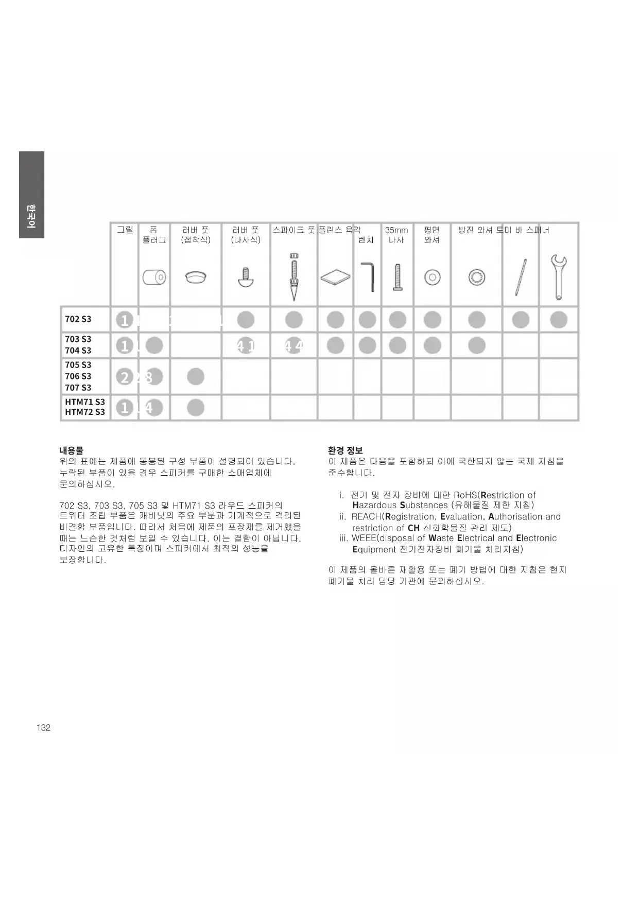這是一款注重安裝的高性能產品,因此我們建議您在開始之前 花一些時間閱讀本手冊。在第 116 頁繼續 Bowers & Wilkins의 창립자 John Bowers는 가정에서 오디오를 제대로 즐기기 위한 핵심 요소는 창의적인 디자인, 혁신적인 엔지니어링 및 고급 기술이라고 생각했습니다. 디자인하는 모든 제품을 공유하고 영감을 불어넣는 노력을 계속해야 한다는 것이 그의 신념입니다. 본 제품은 설치 시 주의가 필요한 고성능 제품이므로 시작하기 전에 시간을 내어 이 설명서를 읽어 보시기 바랍니다. 4 ENGLISH Carton Contents The table above illustrates the component parts that are packed with the product. In the unlikely event that anything is missing please contact the retailer from whom you purchased the speakers. The tweeter assembly on 702 S3, 703 S3, 705 S3 and HTM71 S3 loudspeakers is a decoupled component that is mechanically isolated from the main part of the cabinet. As such, it may appear to be loose when the product is rst removed from its packaging. This is not a fault: it is an inherent feature of the design and ensures optimum performance from your speaker. Environmental Information This product complies with international directives, including but not limited to: