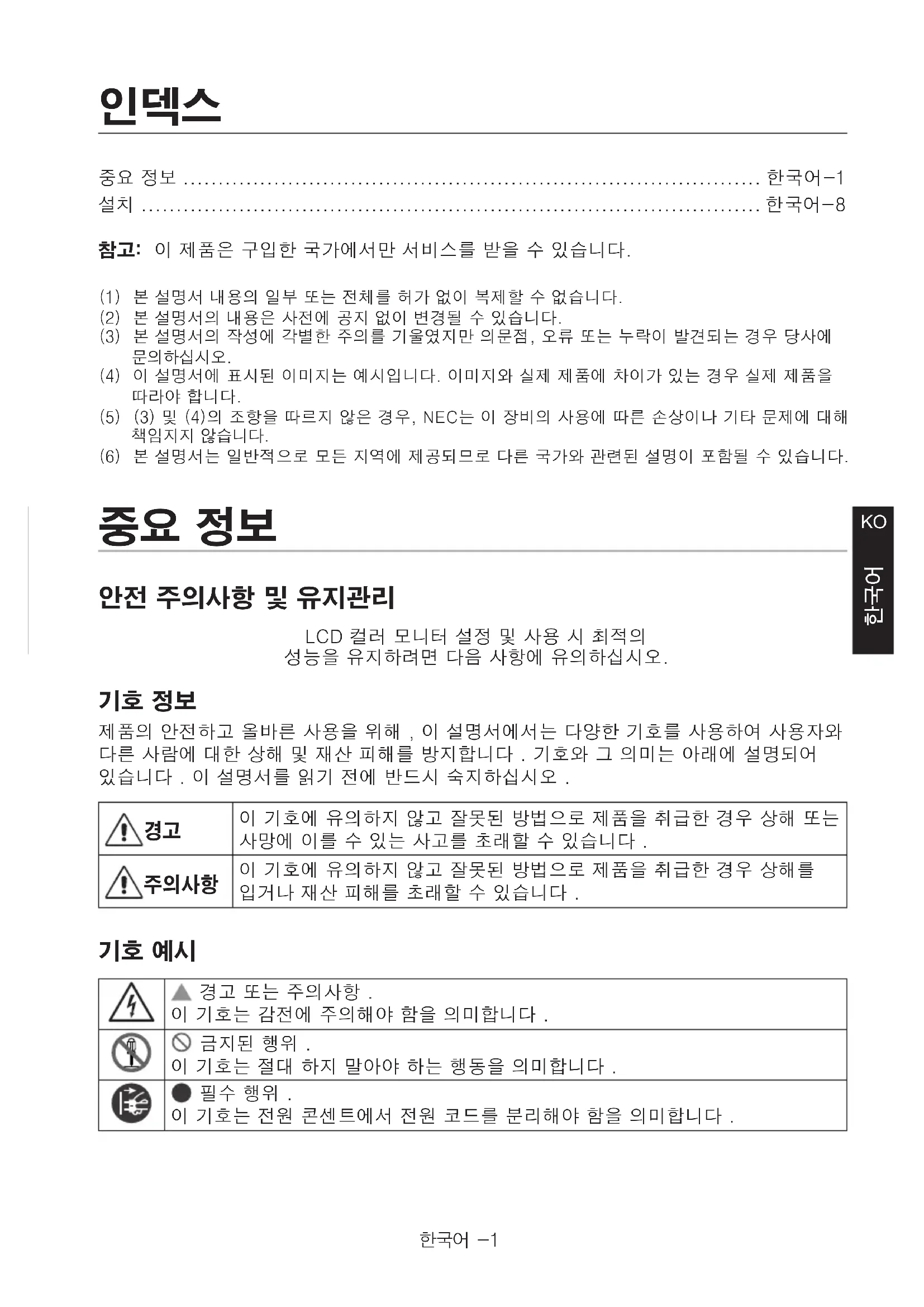 참고: 이 제품은 구입한 국가에서만 서비스를 받을 수 있습니다. (1) 본 설명서 내용의 일부 또는 전체를 허가 없이 복제할 수 없습니다.(2) 본 설명서의 내용은 사전에 공지 없이 변경될 수 있습니다.(3) 본 설명서의 작성에 각별한 주의를 기울였지만 의문점, 오류 또는 누락이 발견되는 경우 당사에 문의하십시오.(4) 이 설명서에 표시된 이미지는 예시입니다. 이미지와 실제 제품에 차이가 있는 경우 실제 제품을 따라야 합니다.(5) (3) 및 (4)의 조항을 따르지 않은 경우, NEC는 이 장비의 사용에 따른 손상이나 기타 문제에 대해 책임지지 않습니다.(6) 본 설명서는 일반적으로 모든 지역에 제공되므로 다른 국가와 관련된 설명이 포함될 수 있습니다.