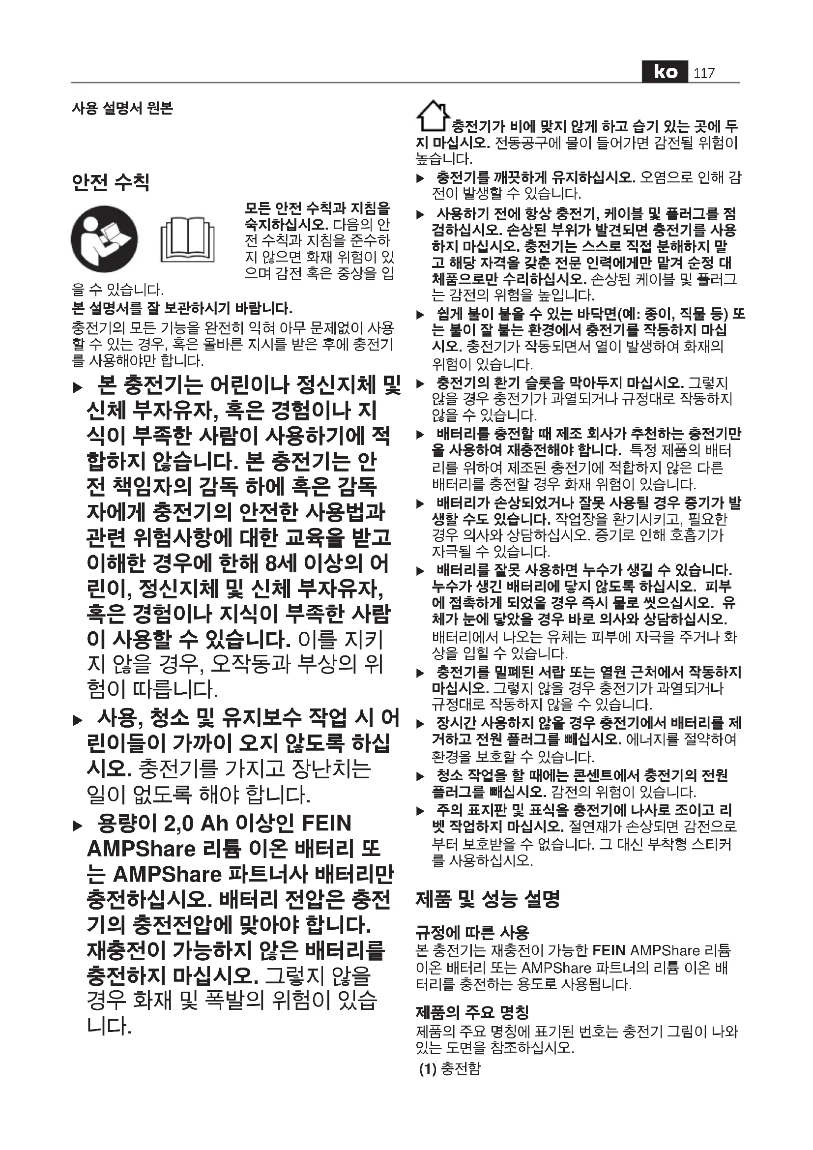 제품 및 성능 설명한국어 규정에 따른 사용한국어 본 충전기는 재충전이 가능한 FEIN AMPShare 리튬 이온 배터리 또는 AMPShare 파트너의 리튬 이온 배 터리를 충전하는 용도로 사용됩니다. 제품의 주요 명칭한국어 제품의 주요 명칭에 표기된 번호는 충전기 그림이 나와 있는 도면을 참조하십시오. (1) 충전함 ko 117 34101363060 • 1.6.22(2) 케이블 감개 (3) 녹색 배터리 충전 표시기 (4) 적색 배터리 충전 표시기