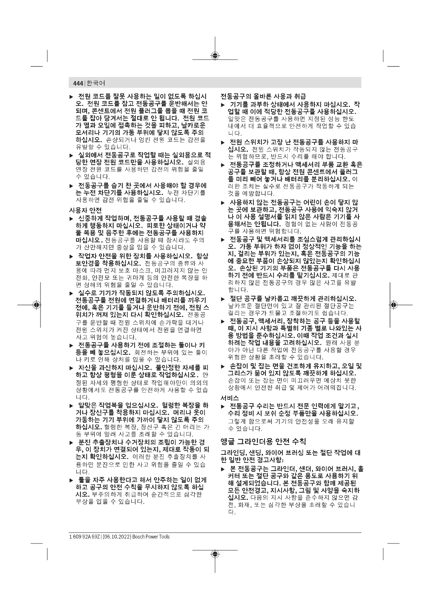 u 파이프 관, 라디에이터, 레인지, 냉장고와 같은 접 지 표면에 몸이 닿지 않도록 하십시오. 몸에 닿을 경우 감전될 위험이 높습니다. u 전동공구를 비에 맞지 않게 하고 습기 있는 곳에 두지 마십시오. 전동공구에 물이 들어가면 감전 될 위험이 높습니다. Bosch Power Tools 1 609 92A 69Z | (06.10.2022)444 | 한국어 u 전원 코드를 잘못 사용하는 일이 없도록 하십시 오. 전원 코드를 잡고 전동공구를 운반해서는 안 되며, 콘센트에서 전원 플러그를 뽑을 때 전원 코 드를 잡아 당겨서는 절대로 안 됩니다. 전원 코드 가 열과 오일에 접촉하는 것을 피하고, 날카로운 모서리나 기기의 가동 부위에 닿지 않도록 주의 하십시오. 손상되거나 엉킨 전원 코드는 감전을 유발할 수 있습니다. u 실외에서 전동공구로 작업할 때는 실외용으로 적 당한 연장 전원 코드만을 사용하십시오. 실외용 연장 전원 코드를 사용하면 감전의 위험을 줄일