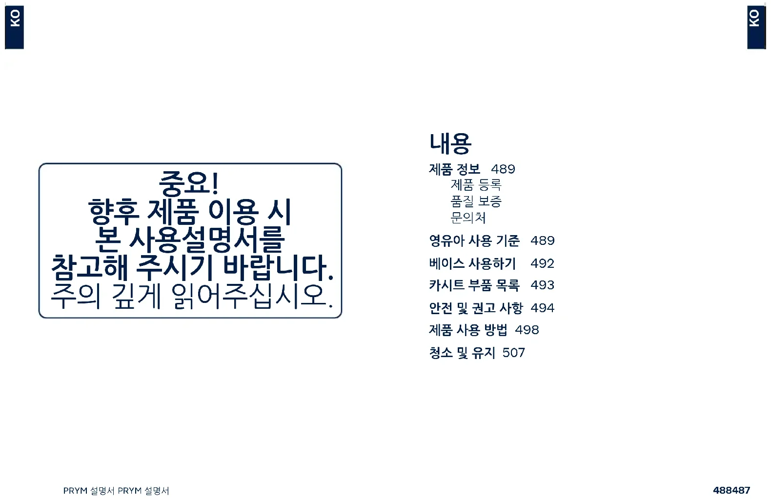 영유아 사용 기준 489 베이스 사용하기 492 카시트 부품 목록 493 안전 및 권고 사항 494 제품 사용 방법 498 청소 및 유지 507