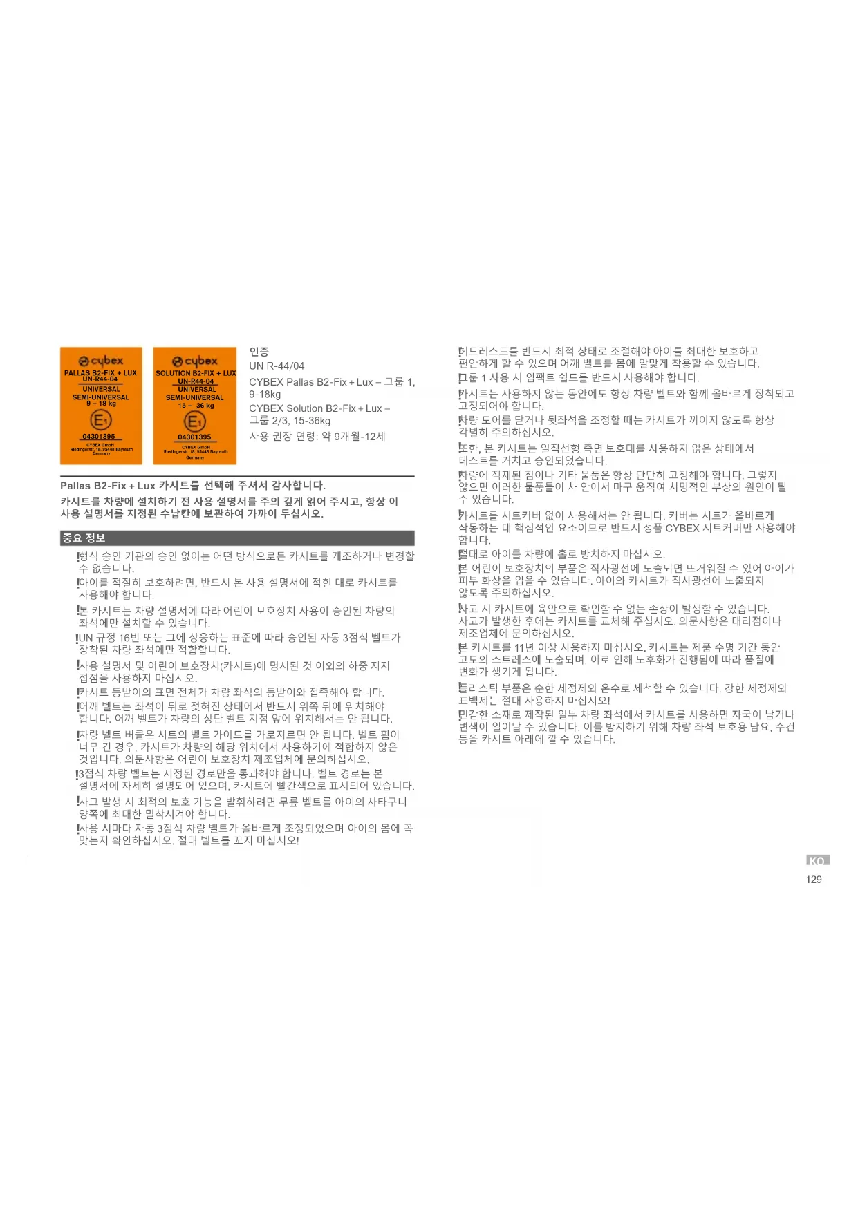 UN R-44/04 CYBEX Pallas B2-Fix + Lux – 그룹 1, 9-18kg CYBEX Solution B2-Fix + Lux – 그룹 2/3, 15-36kg 사용 권장 연령: 약 9개월-12세 Pallas B2-Fix + Lux 카시트를 선택해 주셔서 감사합니다. 카시트를 차량에 설치하기 전 사용 설명서를 주의 깊게 읽어 주시고, 항상 이 사용 설명서를 지정된 수납칸에 보관하여 가까이 두십시오.