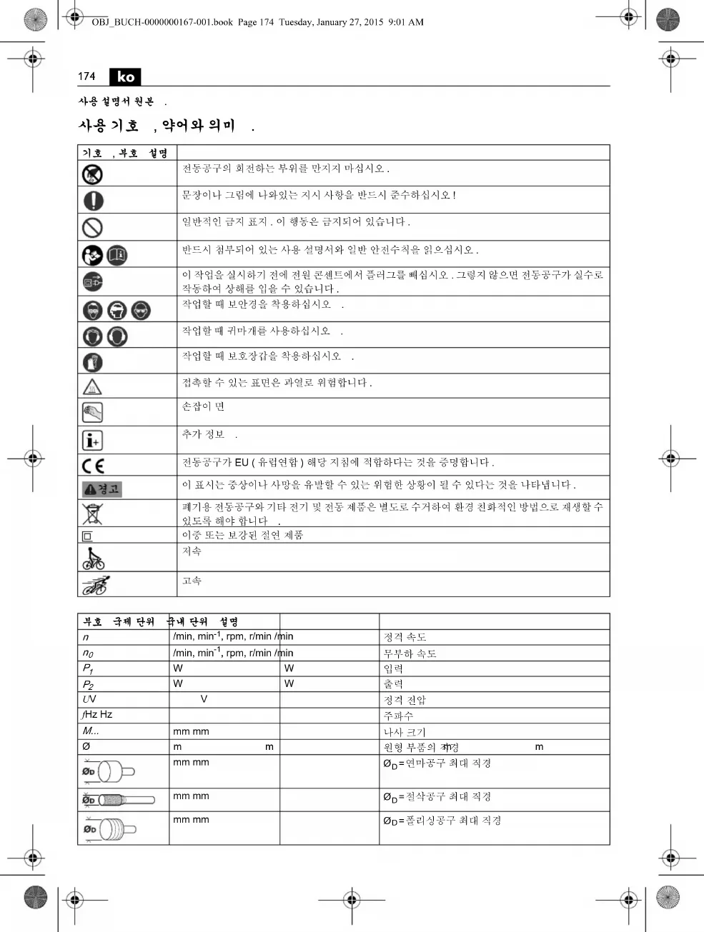 전동공구가 EU ( 유럽연합 ) 해당 지침에 적합하다는 것을 증명합니다 . 이 표시는 중상이나 사망을 유발할 수 있는 위험한 상황이 될 수 있다는 것을 나타냅니다 . 폐기용 전동공구와 기타 전기 및 전동 제품은 별도로 수거하여 환경 친화적인 방법으로 재생할